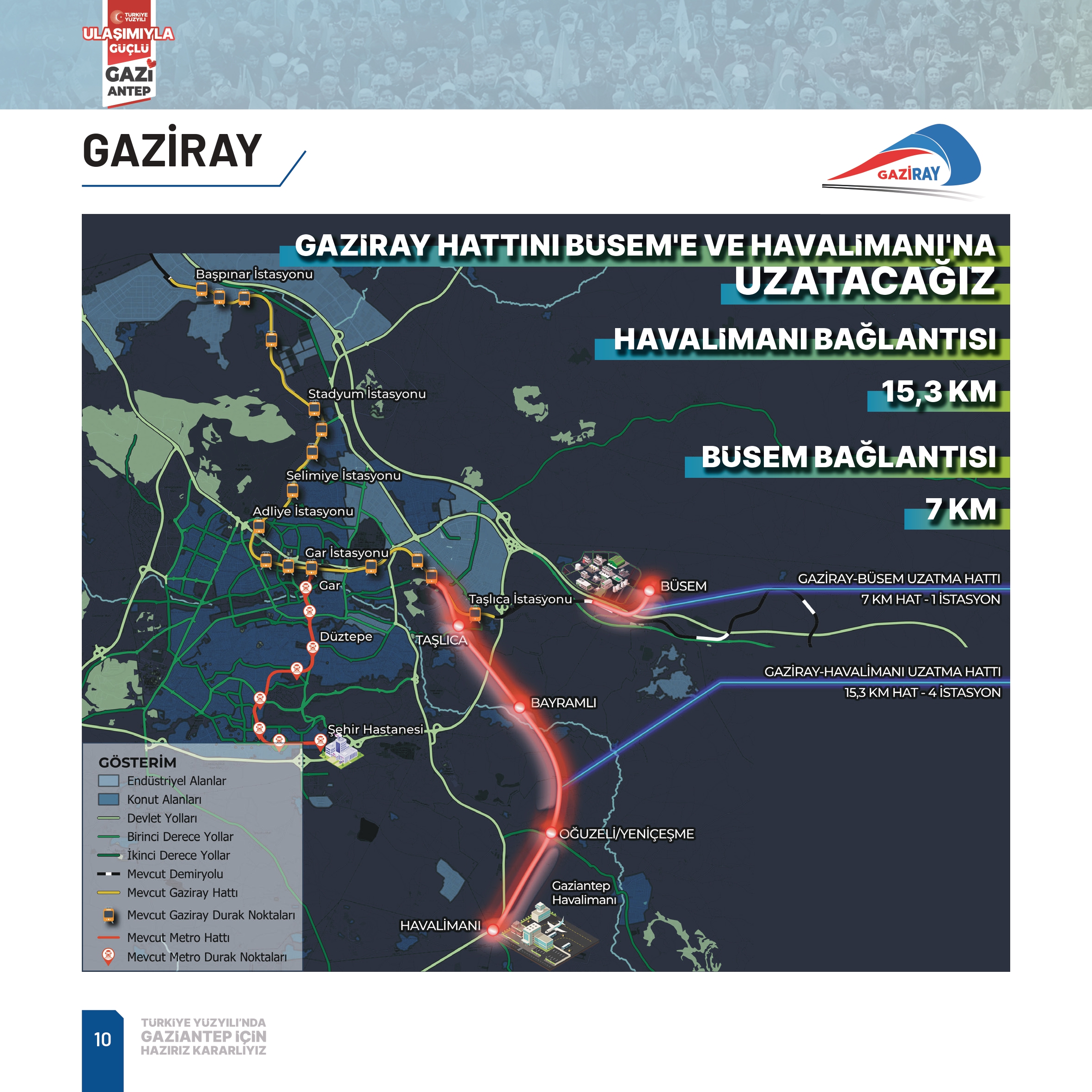 Gaziantep’in ulaşımında önemli bir dönüm noktası olan ve bugünkü rakamıyla 30 milyarlık değere sahip GAZİRAY’ı Havalimanı ve BÜSEM bağlantıları yapılarak uzatılacak.