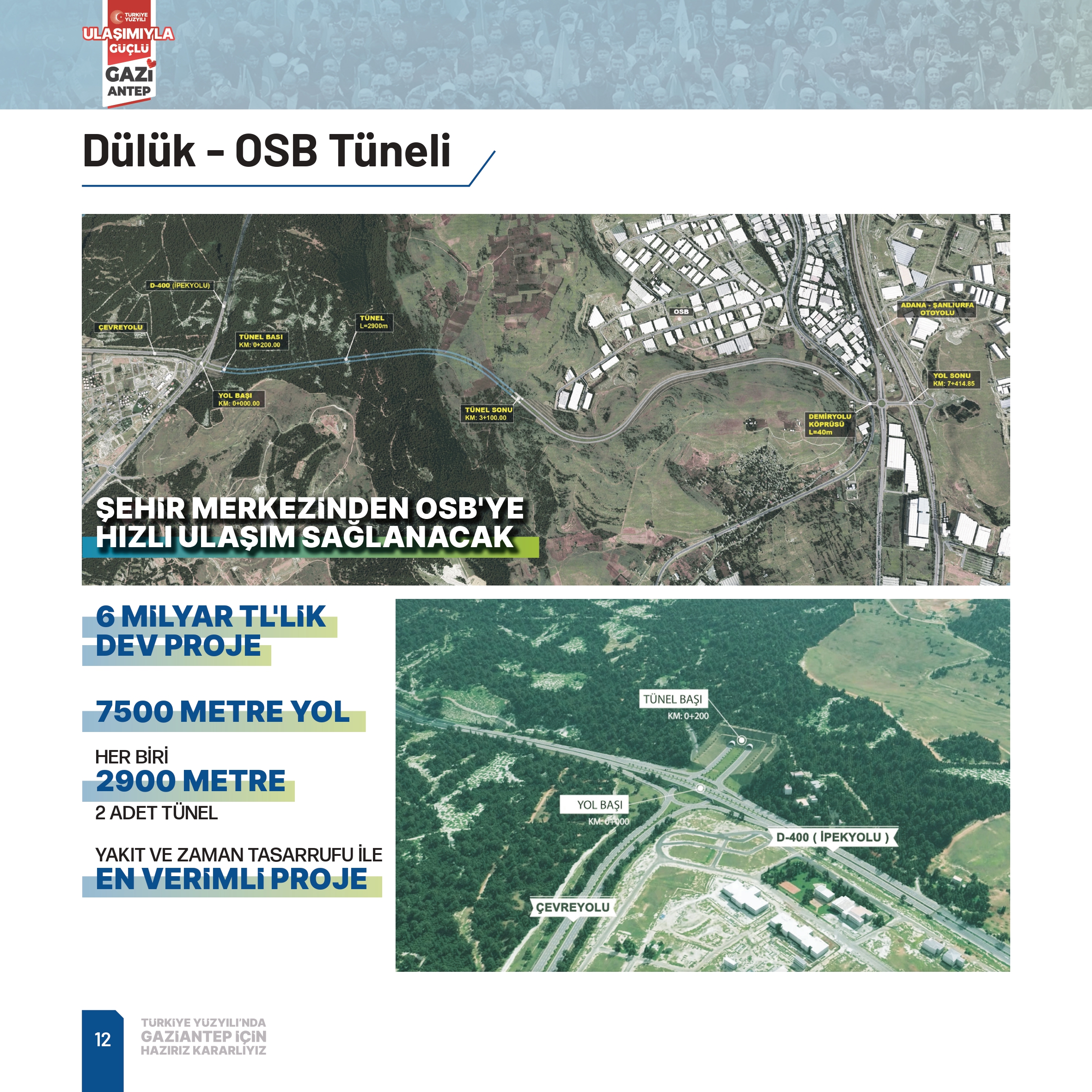 Dülük Tüneli ile 10 OSB’si 250 bin çalışanıyla Türkiye’nin sayılı sanayi bölgelerinden olan Gaziantep Organize Sanayi Bölgesi’ne ulaşım kesintisiz olarak gerçekleştirecek. 5 bin 800 metre uzunluğundaki Dülük Tüneli’yle OSB – kent merkezi hattı için çevre yolu ile alternatif bağlantı sağlanacak. Projenin, Dülük Ormanı kısmı 2 bin 900 metrelik 2 tünelden oluşacak ve ormanın doğal ve tarihi yapısı da korunmuş olacak. 6 milyar TL’lik dev proje, Çevreyolu ile D-400’ün kesişim noktasından başlayacak, OSB ve Adana-Şanlıurfa Otoyolu’na (TAG) bağlanacak. Tünel kısmı gidiş geliş 3’er şeritten oluşacak. Proje tamamlandığında yakıt ve zaman tasarrufu sağlanacak.