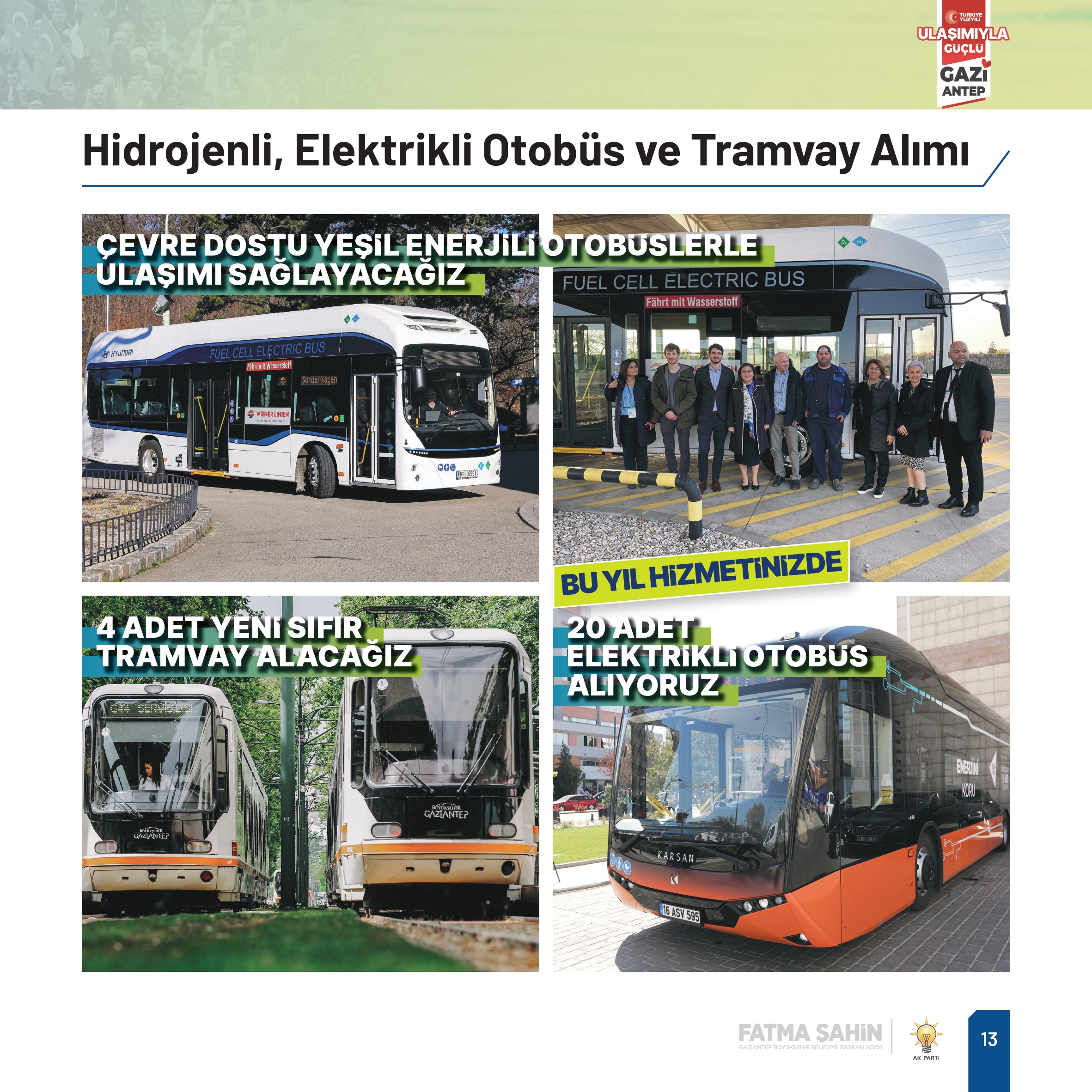 Daha temiz bir çevre için Fatma Şahin başkanlığında yeni döneminde 4 yeni tramvay alımı yapılacak, toplu taşımada otobüs filolarına 20 yeni elektrikli otobüs katılacak.