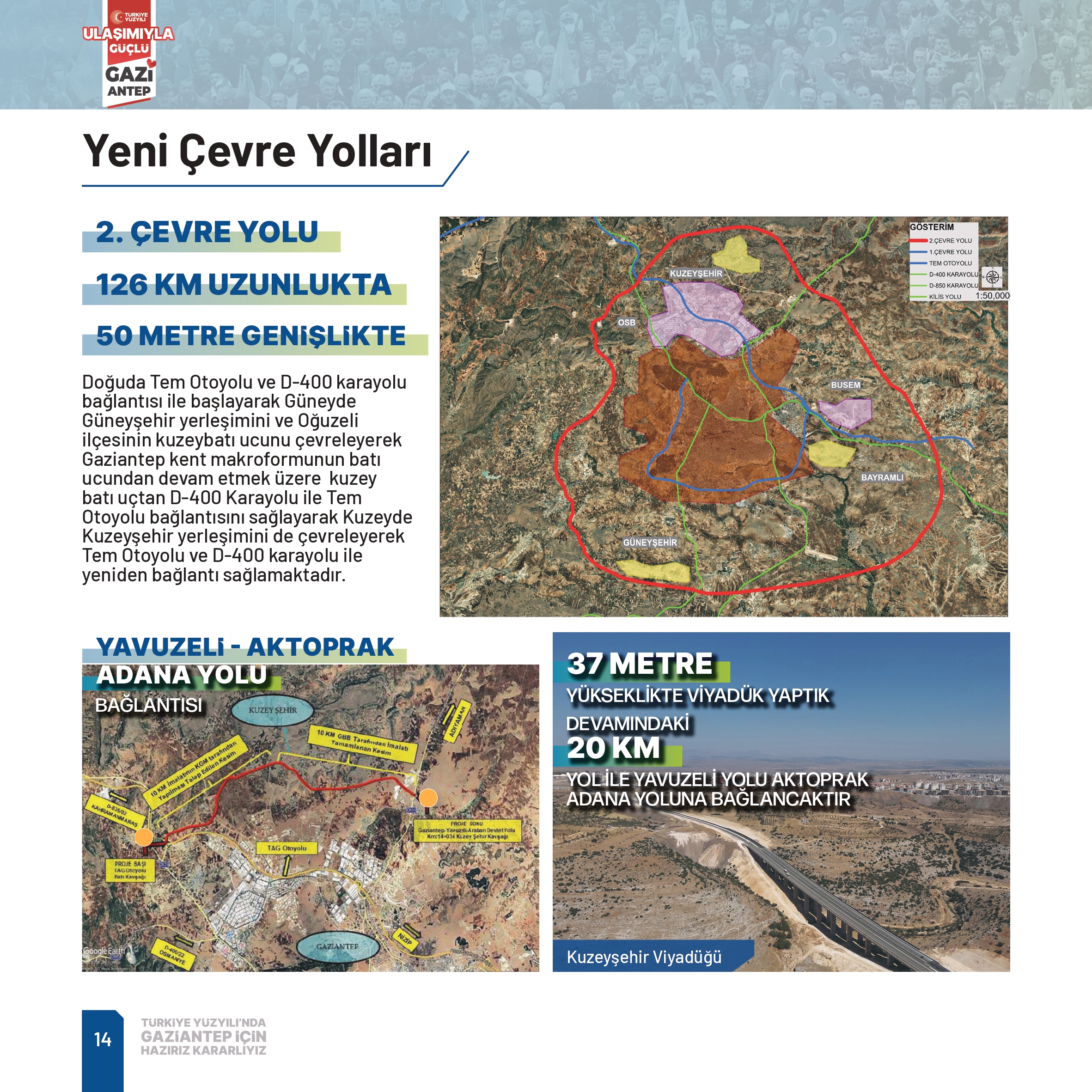 Gelişen şehrin yeni çevre yolu ihtiyacı için Başkan Fatma Şahin yeni projesiyle sorunu çözecek. 126 kilometre uzunluğunda, 50 metre genişliğindeki yeni çevre yolu, doğuda Tem Otoyolu ve D-400 karayolu bağlantısı ile başlayarak, güneyde Güneyşehir yerleşimini ve Oğuzeli ilçesinin kuzeybatı ucunu çevreleyecek. Gaziantep’in batı ucundan devam etmek üzere kuzey batı uçtan D-400 Karayolu ile Tem Otoyolu bağlantısını sağlayarak kuzeyde Kuzeyşehir yerleşimini de kapsayarak Tem Otoyolu ve D-400 karayolu ile yeniden bağlantı sağlanacak.