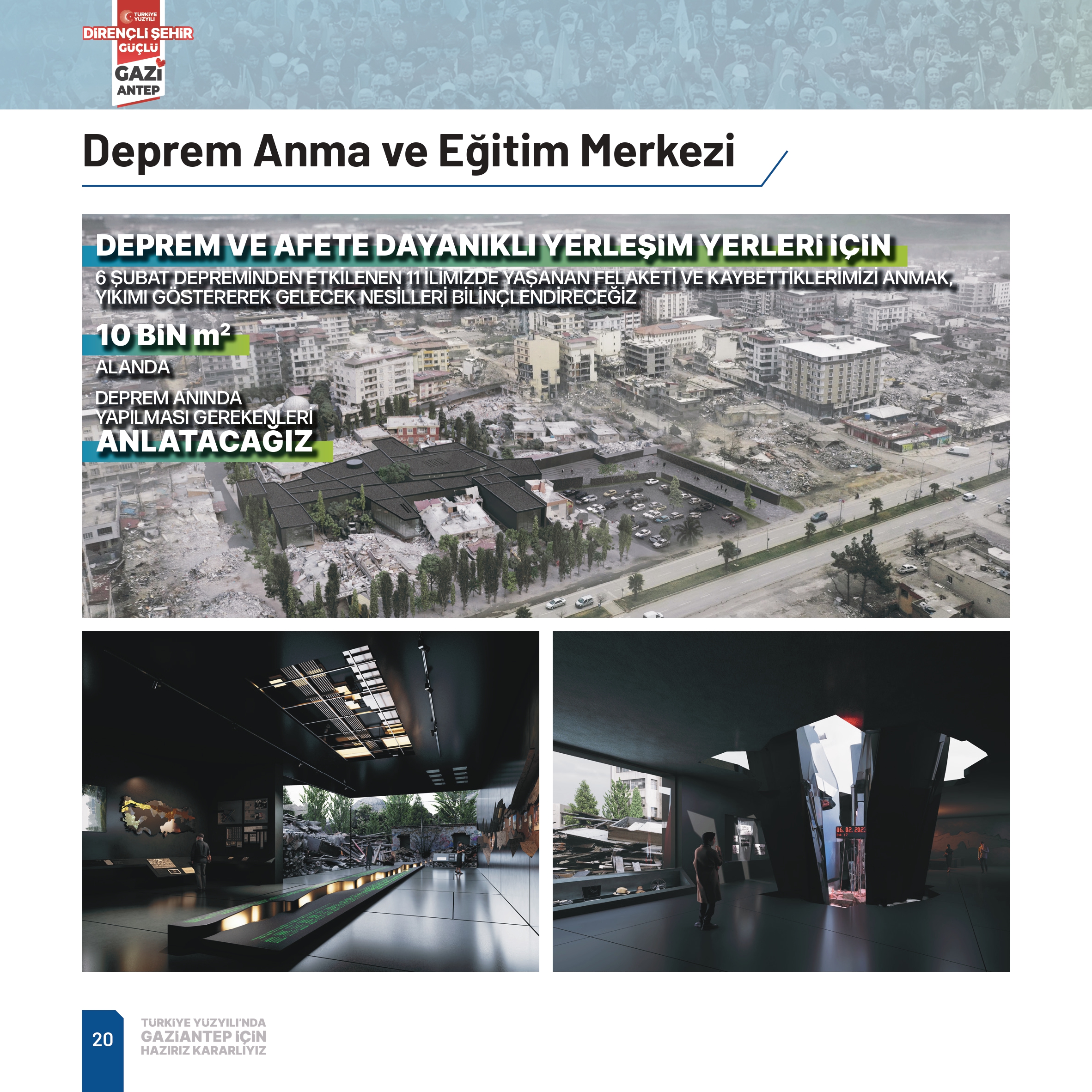 6 Şubat Kahramanmaraş merkezli depremlerden etkilenen 11 il içinde olan Gaziantep’te, Nurdağı’nda 10 bin metrekare alanda hayatını kaybedenleri anmak, yıkımı göstererek gelecek nesilleri bilinçlendirecek, deprem anında yapılması gerekenleri anlatacak, aynı zamanda mimarlık ve inşaat mühendisliği eğitimi alan öğrencilerin eğitim amaçlı ziyaret edebileceği Deprem Anma ve Eğitim Merkezi yapılacak.