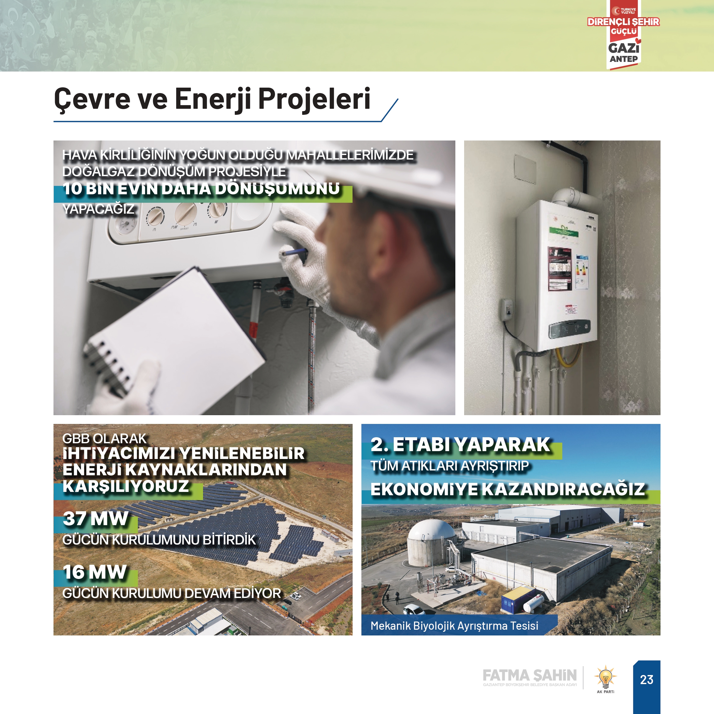 Başkan Şahin’in ustalık döneminde hava kirliliğinin yoğun olduğu mahallelerde 10 bin evin daha doğalgaz dönüşümü yapılacak. Enerji ihtiyacını yenilebilir enerji kaynaklarından karşılayan Gaziantep Büyükşehir, 37 megawattlık güneş enerjisi gücün kurulumunu tamamlarken 16 megawatt yeni güneş enerjisi panelinin kurulumunu sürdürüyor. Öte yandan Mekanik Biyolojik Ayrıştırma Tesisi’nin 2’nci etabı tamamlanarak tüm atıkları ayrıştırarak ekonomiye kazandırılacak.
