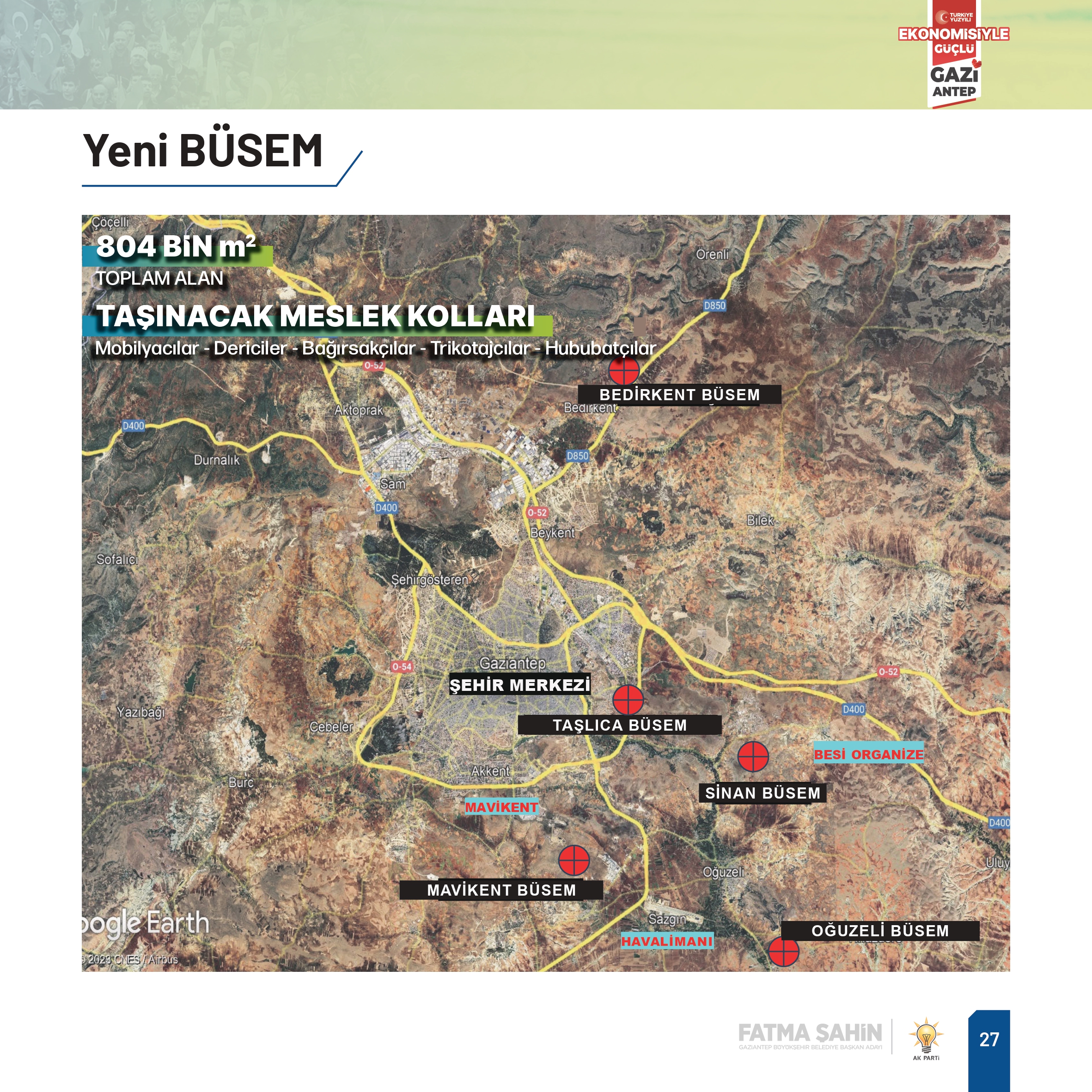 Diğer BÜSEM’ler için konum olarak Bedirkent, Taşlıca, Mavikent, Sinan ve Oğuzeli belirlendi. Kurulacak yeni 5 BÜSEM toplam 804 bin metrekare olurken mobilyacılar, dericiler, bağırsakçılar, trikotajcılar ve hububatçılar için yeni iş yerleri ortaya çıkacak.