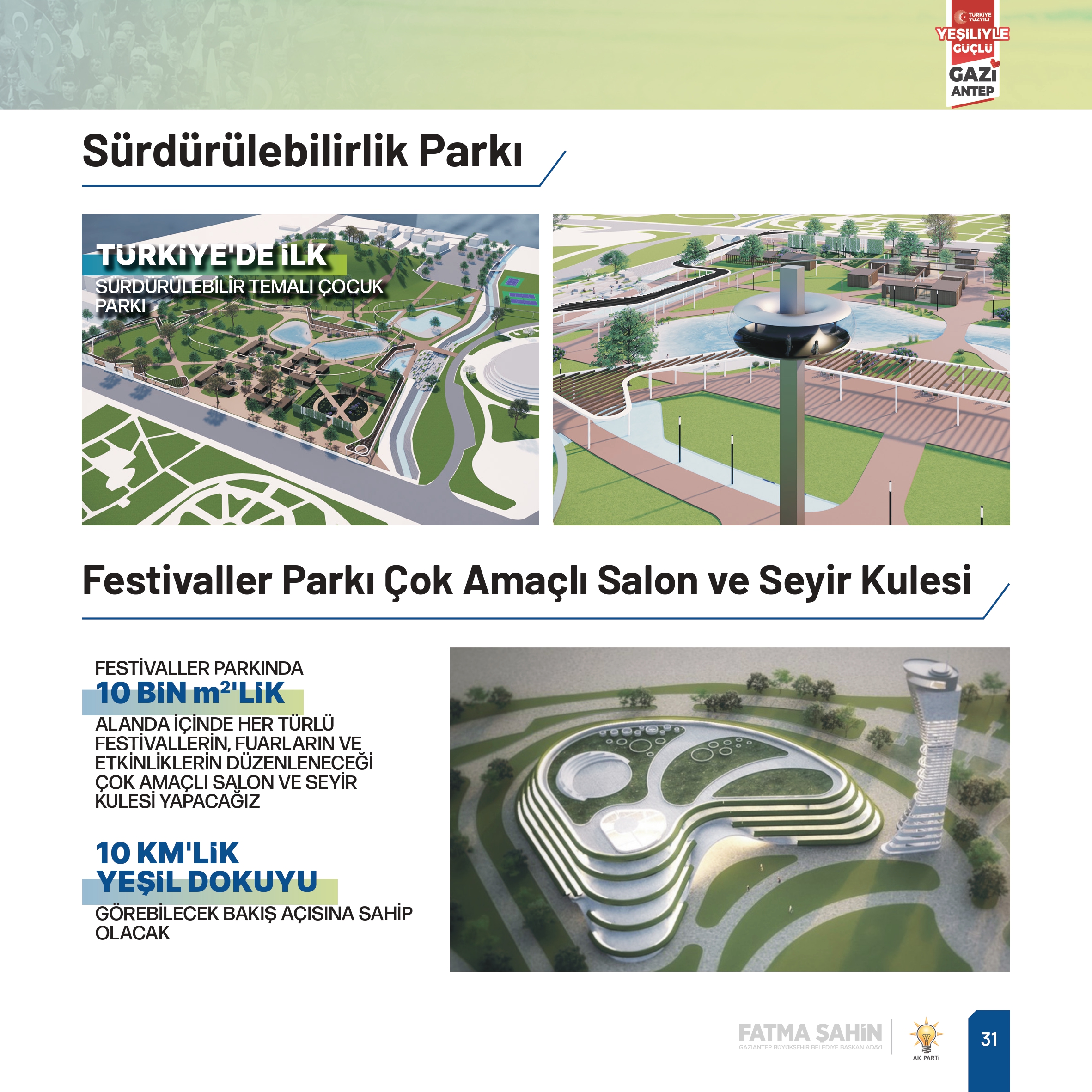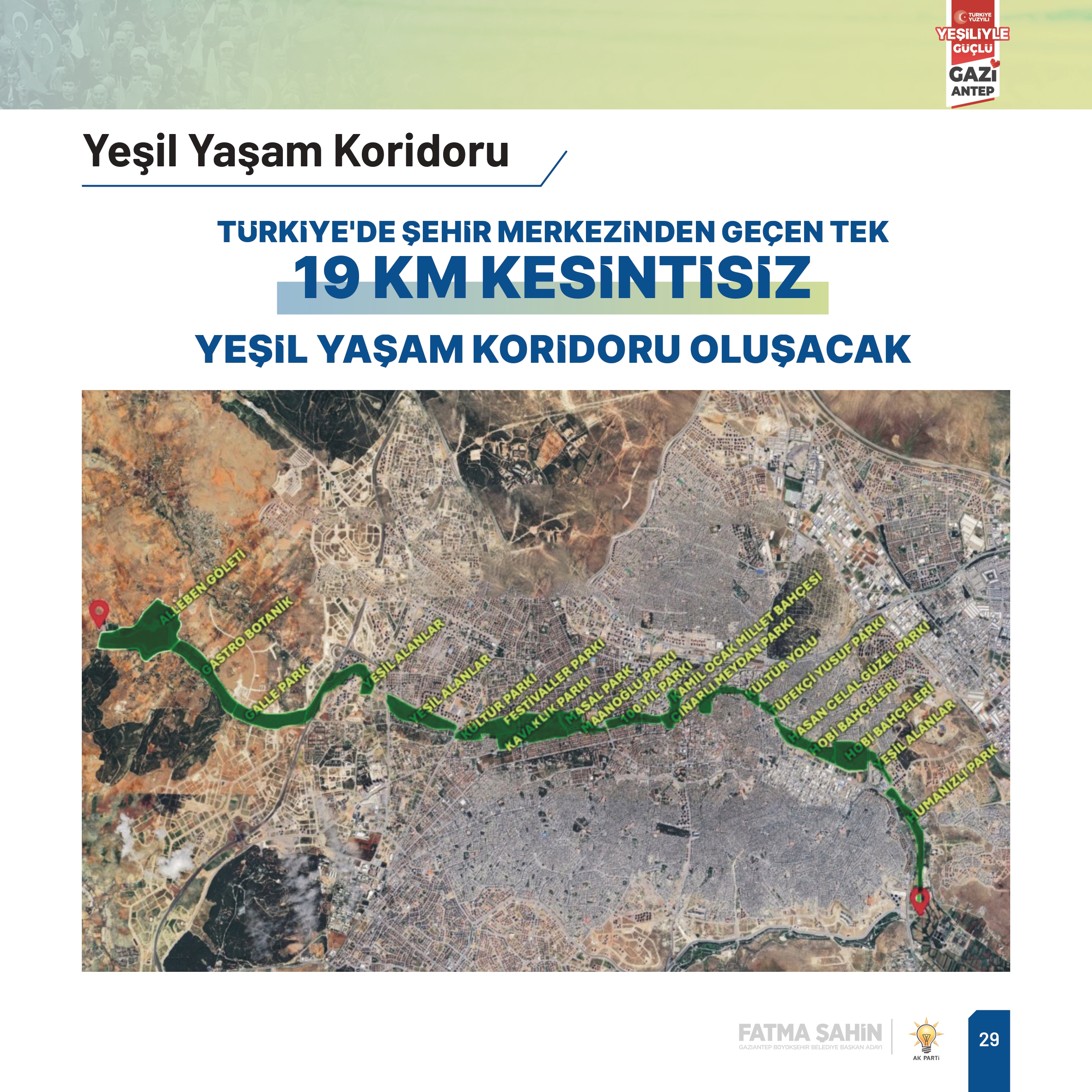 Şehrin grileşen yüzünü son 10 senede yeşile boyayan, ağaçlandırma çalışmalarıyla kentin her noktasını yeşillendiren Başkan Fatma Şahin, yeni döneminde yeni çalışmalarla şehre nefes aldıracak. Şehir merkezinde yapılacak çalışmalarla Türkiye'de şehir merkezinden geçen tek 19 kilometre kesintisiz yeşil yaşam koridoru oluşturulacak.