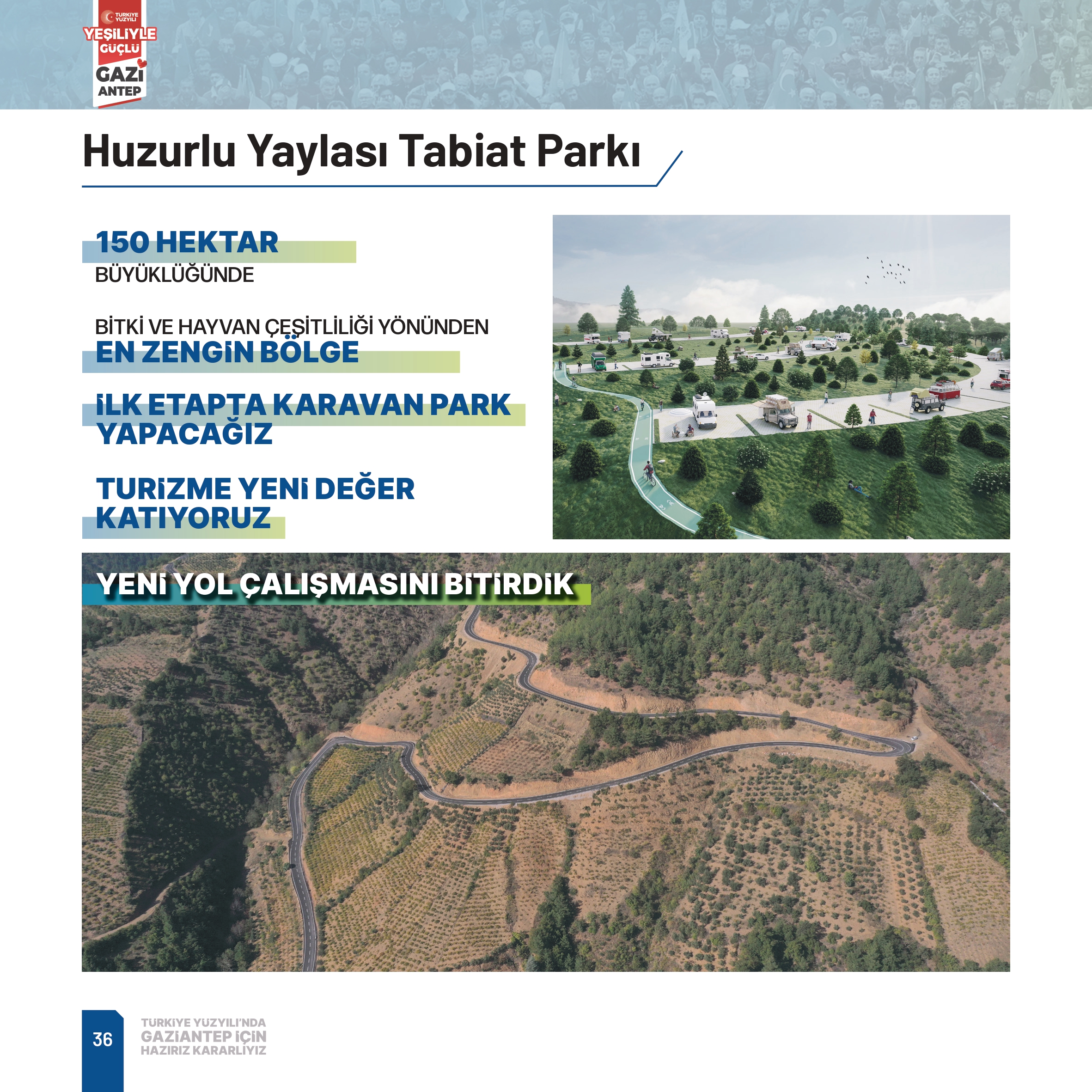 Yayla turizmini canlandırmak amacıyla Huzur Yaylası Tabiat Parkı kurulacak. Bitki ve hayvan çeşitliliği bakımından zengin bölge olan Huzur Yaylası için yeni yol çalışması tamamlandı. 150 hektar büyüklüğünde alanda ilk etapta karavan park yapılacak.