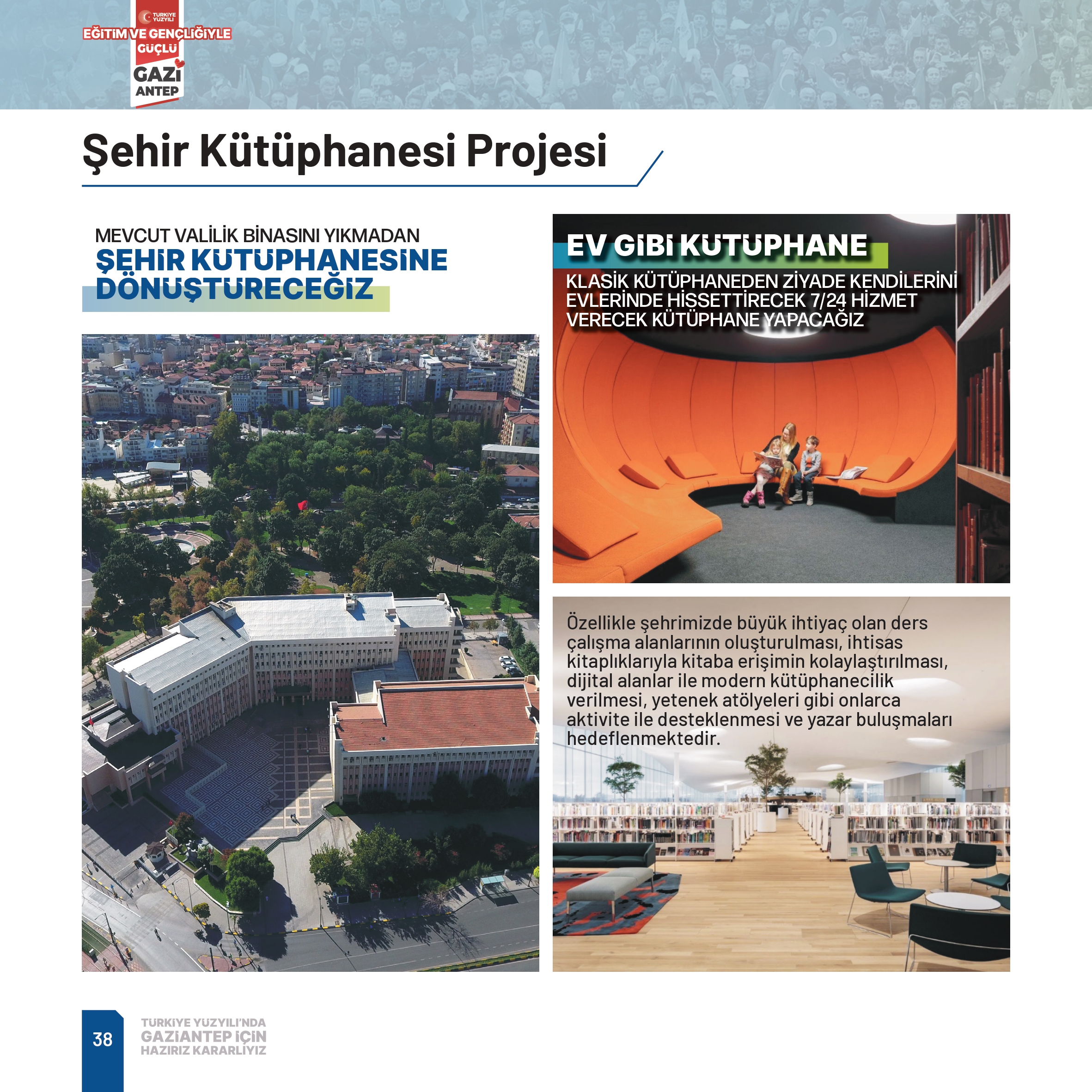 Özellikle Gazi şehirde büyük ihtiyaç olan ders çalışma alanlarının oluşturulması, ihtisas kitaplıklarıyla kitaba erişimin kolaylaştırılması, dijital alanlar ile modern kütüphanecilik hizmetleri verilmesi, yetenek atölyeleri gibi onlarca etkinlikle desteklenmesi ve yazar buluşmaları hedefleniyor.