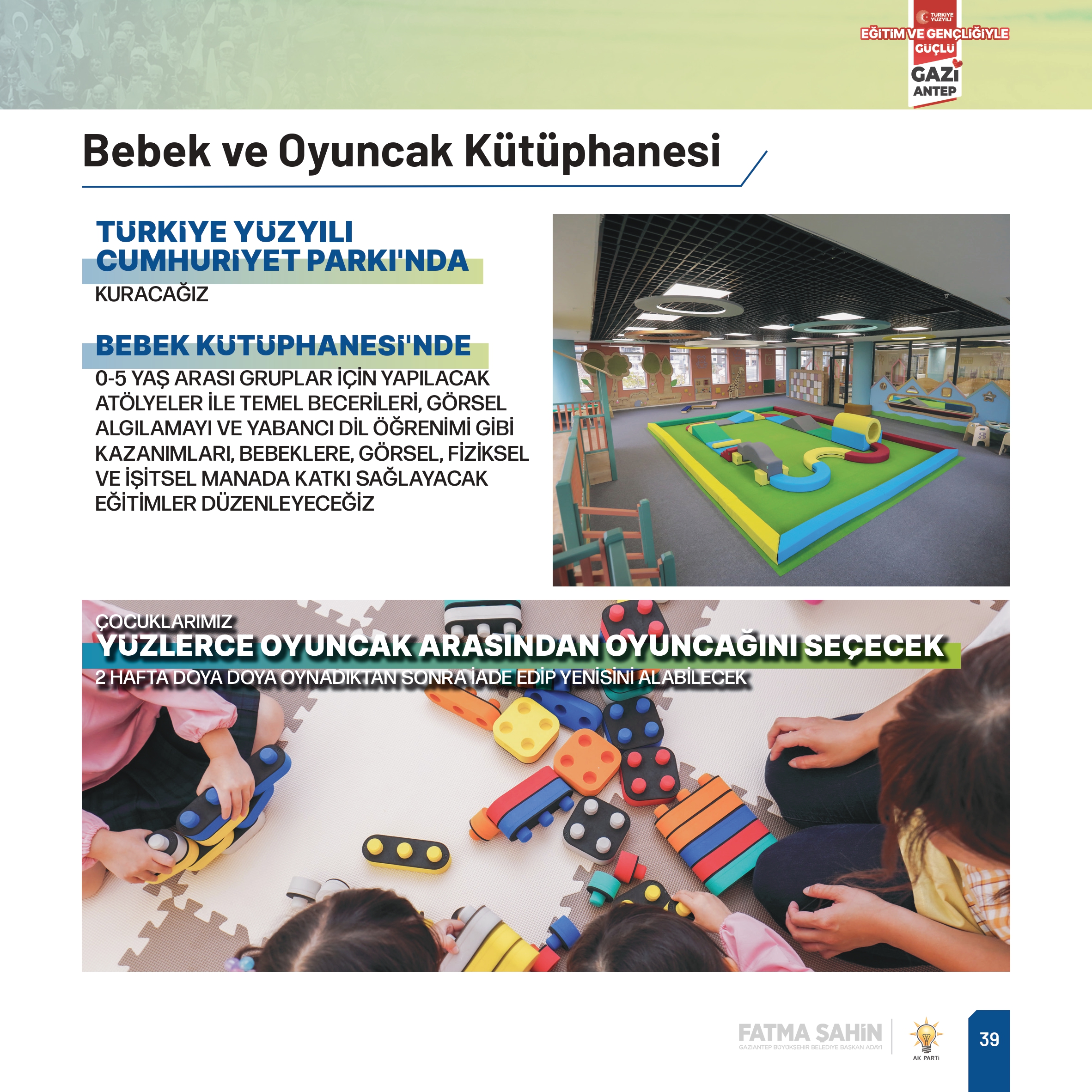Gaziantep Büyükşehir Belediyesi’nin Çocuk Kütüphanesi projesi sonrasında yeni dönemde Bebek ve Oyuncak Kütüphanesi kurulacak. Türkiye Yüzyılı Cumhuriyet Parkı'nda yer alacak kütüphane, 0-5 yaş arası gruplar için yapılacak atölyeler ile temel becerileri, görsel algılamayı ve yabancı dil öğrenimi gibi kazanımları, bebeklere, görsel, fiziksel ve işitsel anlamda katkı sağlayacak. Kütüphanede çocuklar yüzlerce oyuncak arasından oyuncağını seçecek, iki hafta oynadıktan sonra iade edip yenisini alabilecek.