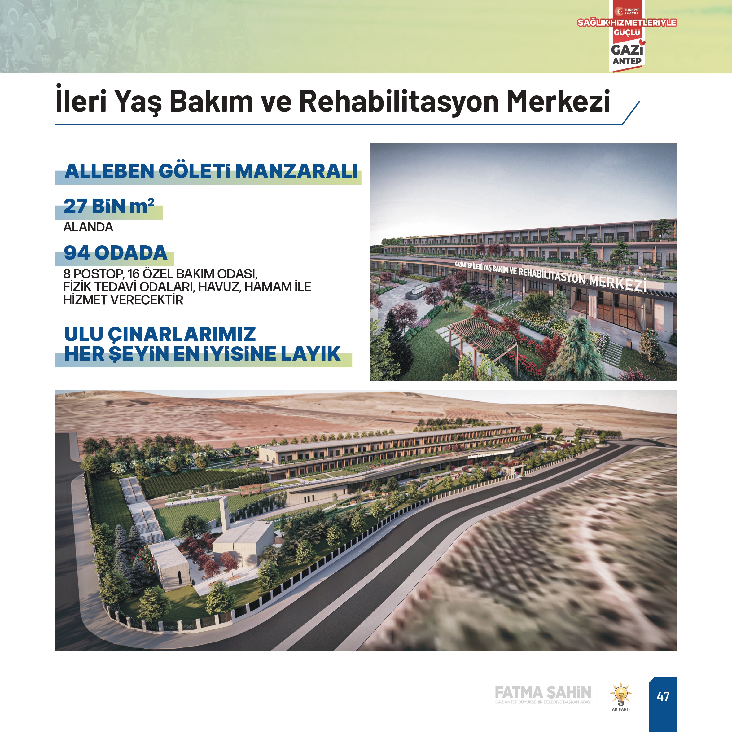 Kentte yaşayan yaşlıların hizmetine sunulacak 27 bin metrekare alanda 94 odadan oluşacak yeni İleri Yaş Bakım ve Rehabilitasyon Merkezi, 8 postop, 16 özel bakım odası, fizik tedavi odaları, havuz, hamam ile hizmet verecek.
