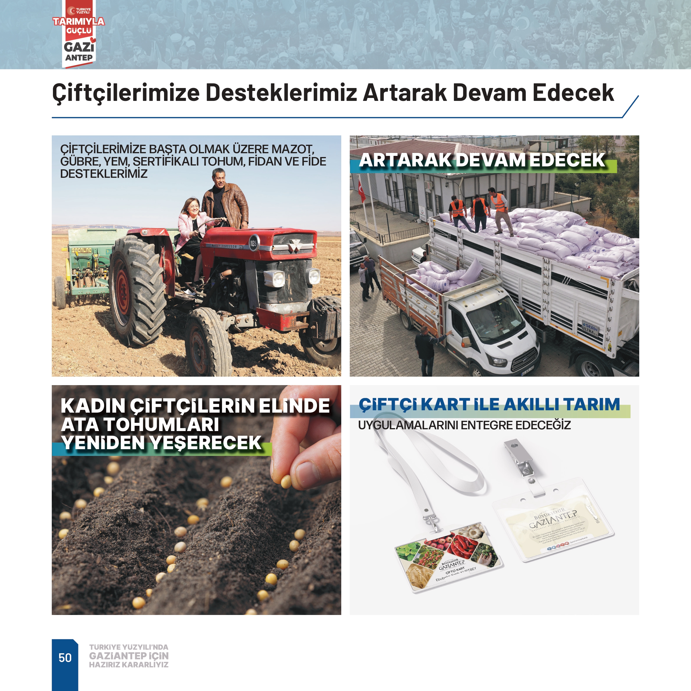 Çiftçilere başta olmak üzere mazot, gübre, yem, sertifikalı tohum, fidan ve fide destekleri artarak devam edecek. İlçelerde kurulan kadın kooperatifleri eliyle başlatılan ata tohumuna dönüş projesi kapsamında yeni tohumlar üretilecek.