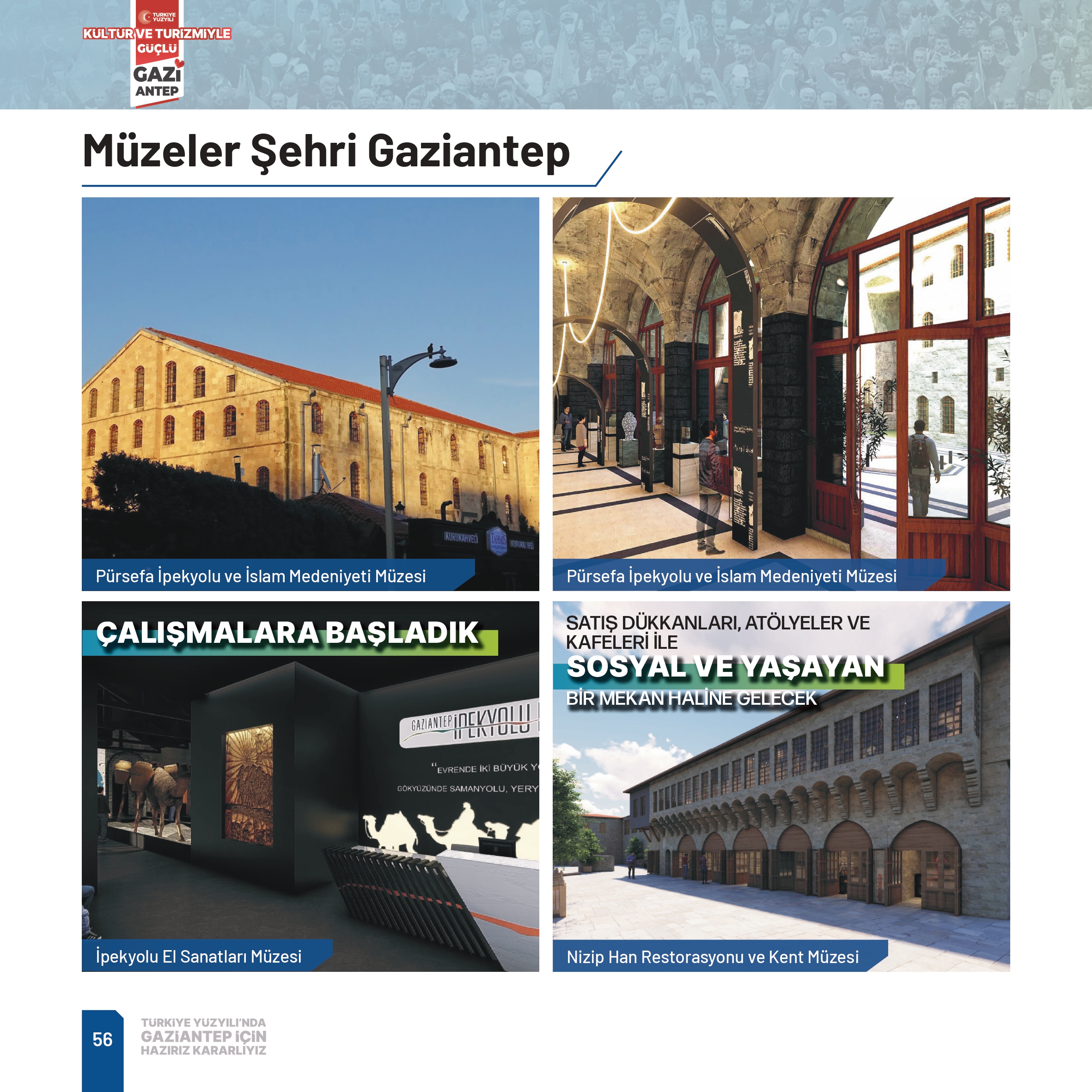 Sabun, pekmez ve zeytinyağı üretim süreçlerini anlatan, ziyaretçinin yapımını deneyimleyeceği Sabun ve Pekmez Müzesi için sona yaklaşılırken eski Merkez Bankası, Para Müzesi’ne dönüştürülecek. Eski Ticaret Lisesi binasında, Gazi şehrin tarihi belleğinin korunduğu Bellek Gaziantep Müzesi şehre kazandırılacak. Öte yandan Pürsefa İpekyolu ve İslam Medeniyeti Müzesi, İpekyolu El Sanatları Müzesi ve Nizip Han Restorasyonu ve Kent Müzesi çalışmaları başladı.