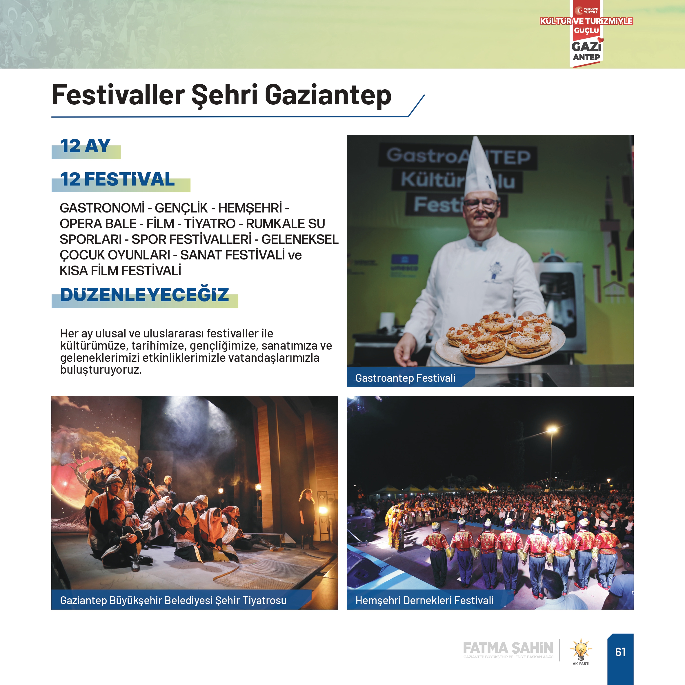 Her ay yapılacak ulusal ve uluslararası festivallerle kültürümüze, tarihimize, gençliğimize, sanatımıza ve geleneklerimiz vatandaşlarla buluşturulacak. Bu kapsamda gastronomi, gençlik, hemşehri, opera bale, film, tiyatro, Rumkale su sporları, spor festivalleri, geleneksel çocuk oyunları, sanat festivali, bilim filmleri ve kısa film festivali düzenlenecek.