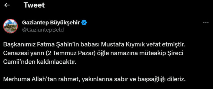 "Başkanımız Fatma Şahin’in babası Mustafa Kıymık vefat etmiştir. Cenazesi yarın (2 Temmuz Pazar) öğle namazına müteakip Şireci Camii’nden kaldırılacaktır.