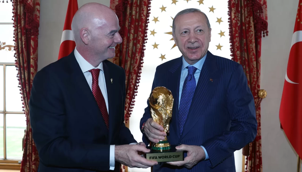Cumhurbaşkanlığı Dolmabahçe Çalışma Ofisi'nde gerçekleşen kabulde, FIFA Başkanı Infantino, Cumhurbaşkanı Erdoğan'a, arkasında "Erdoğan" yazılı 26 numaralı forma, dünya kupası replikası ve dünya kupasında oynanan topu hediye etti.