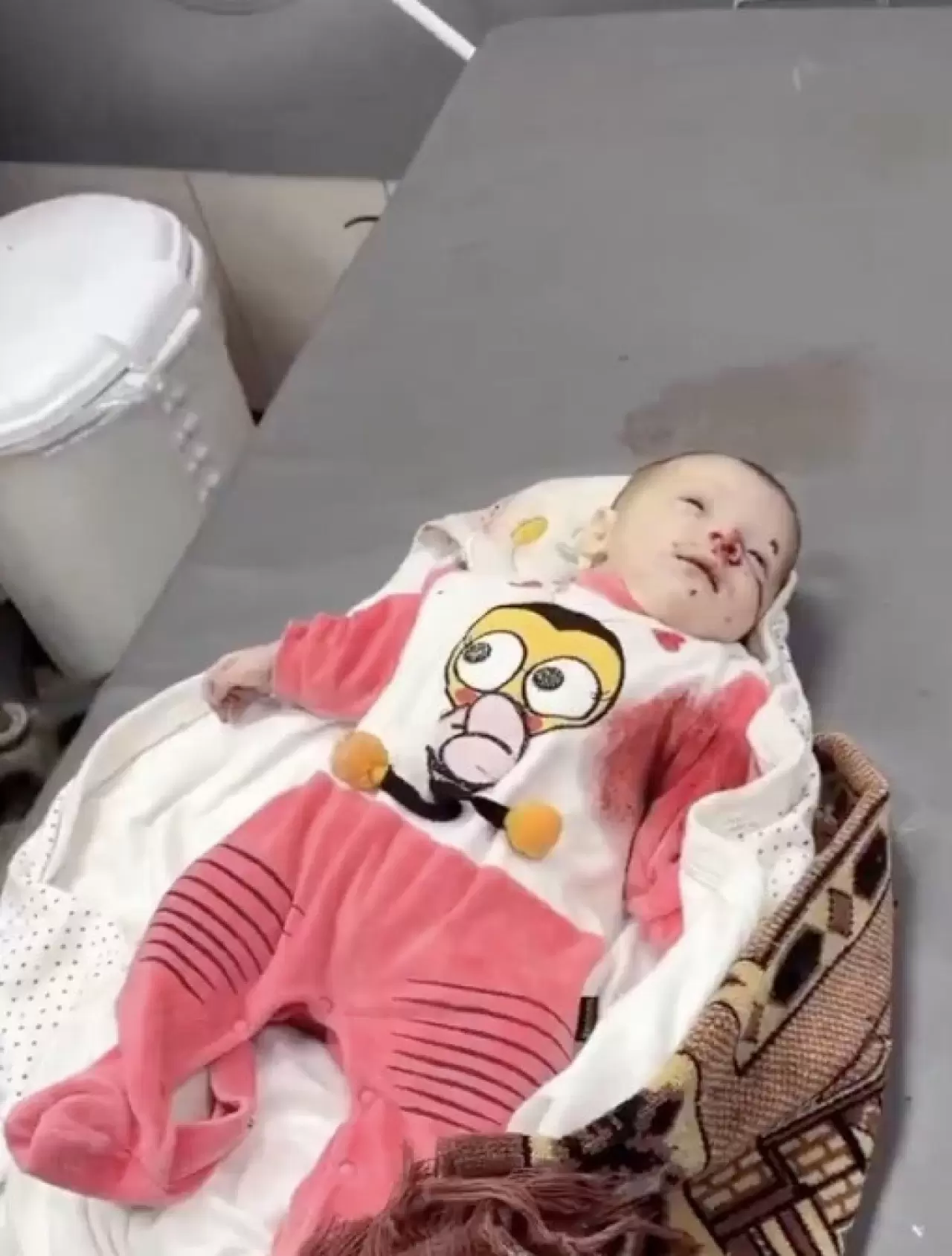 Bir bebeğin, saldırılar sonra kıyafetinin kana bulandığı ve son nefesini verdiği görüldü.