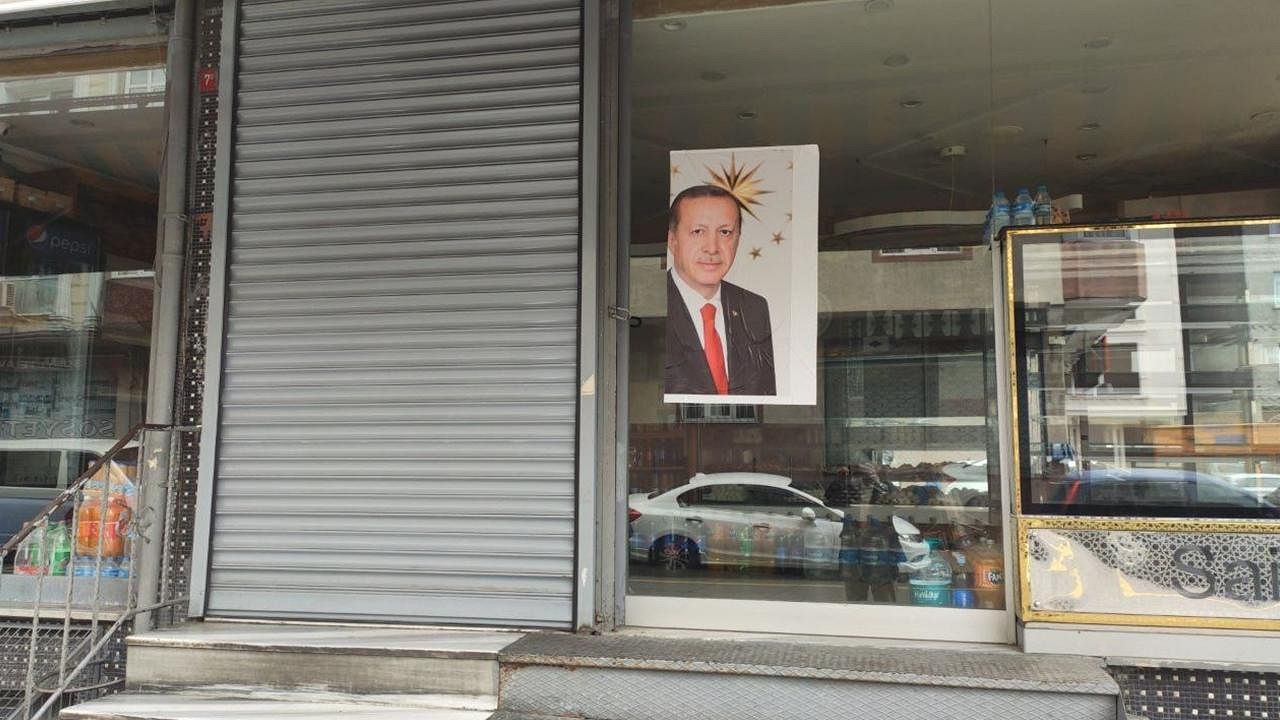 Kapatılan iş yerinin camına Cumhurbaşkanı Recep Tayyip Erdoğan'ın posterinin asıldığı görüldü.