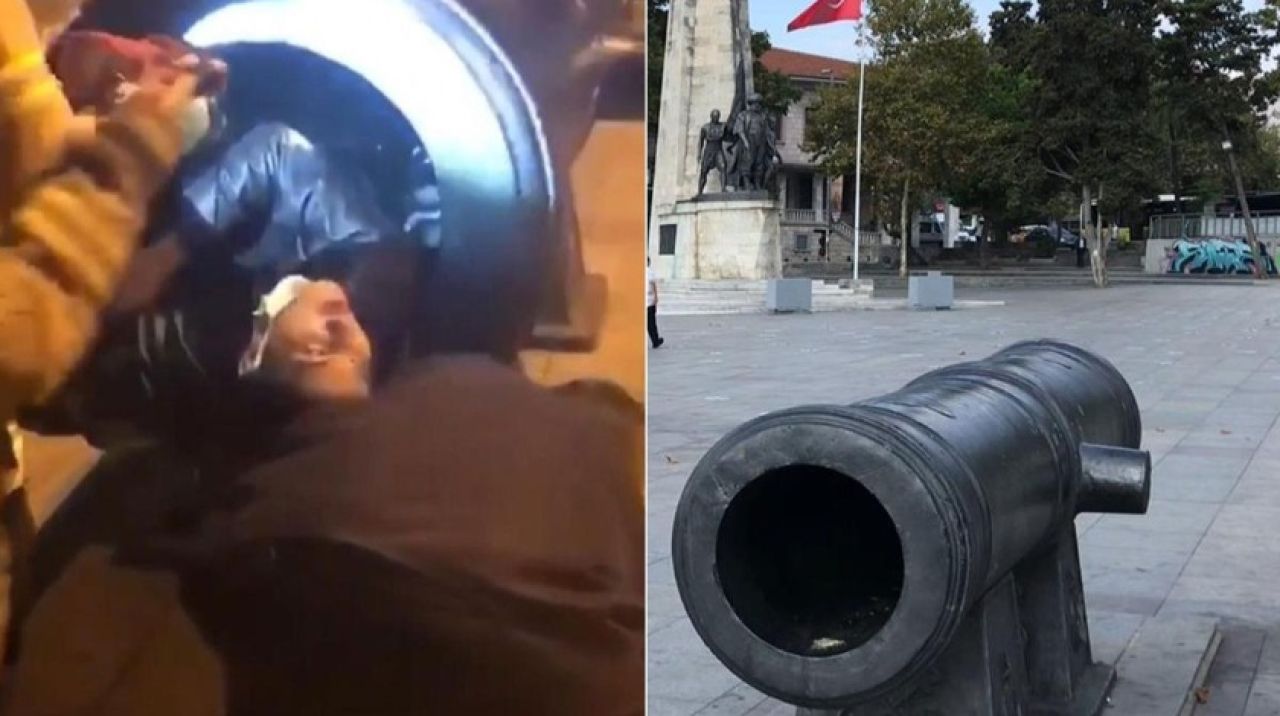 Beşiktaş Sahili'nde sergilenen tarihi savaş topunun içine girip sıkışan kişiyi itfaiye ekibi kurtardı.