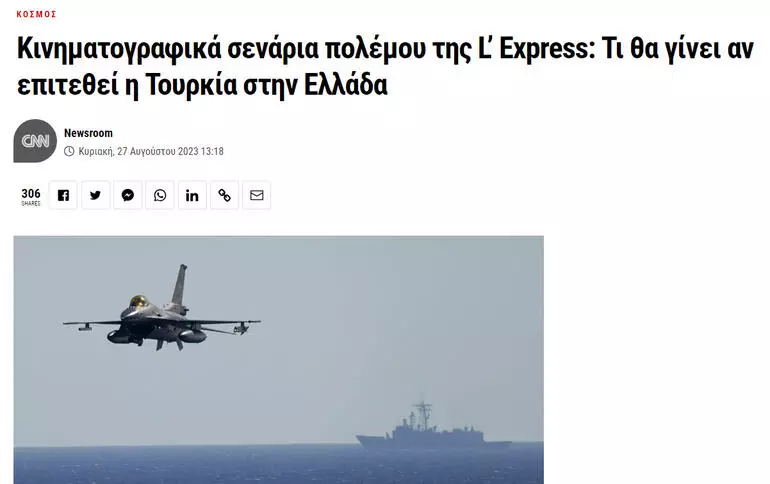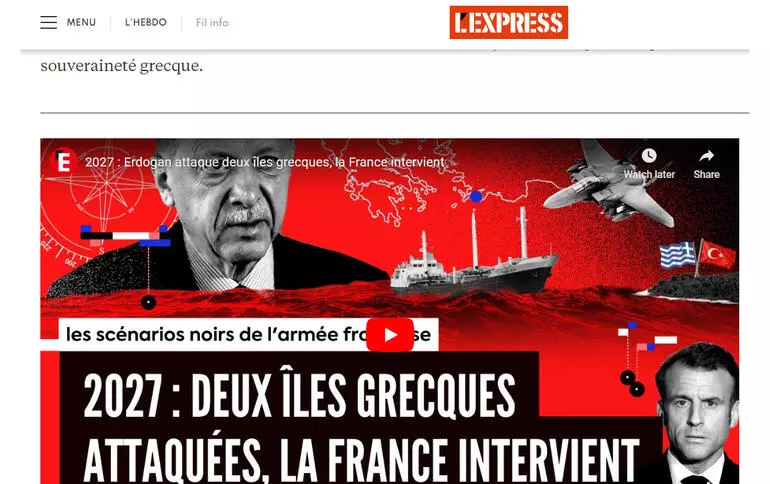 Fransız L'Express tarafından geçtiğimiz hafta yayınlanan savaş senaryosunu manşetine taşıyan Haber platformu 'L'Express savaş filmi senaryoları: Ya Türkiye Yunanistan'a saldırırsa' başlığı ile okurlarının karşısına çıktı.
