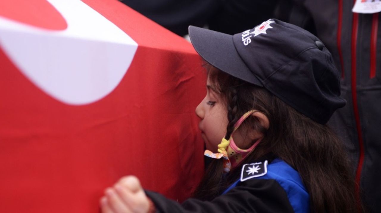Törende, polis üniforması giyen şehidin 7 yaşındaki kızı Zeynep Sena, babasının tabutundaki fotoğrafını öpüp, polis selamı verdi.