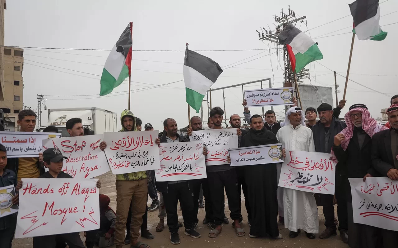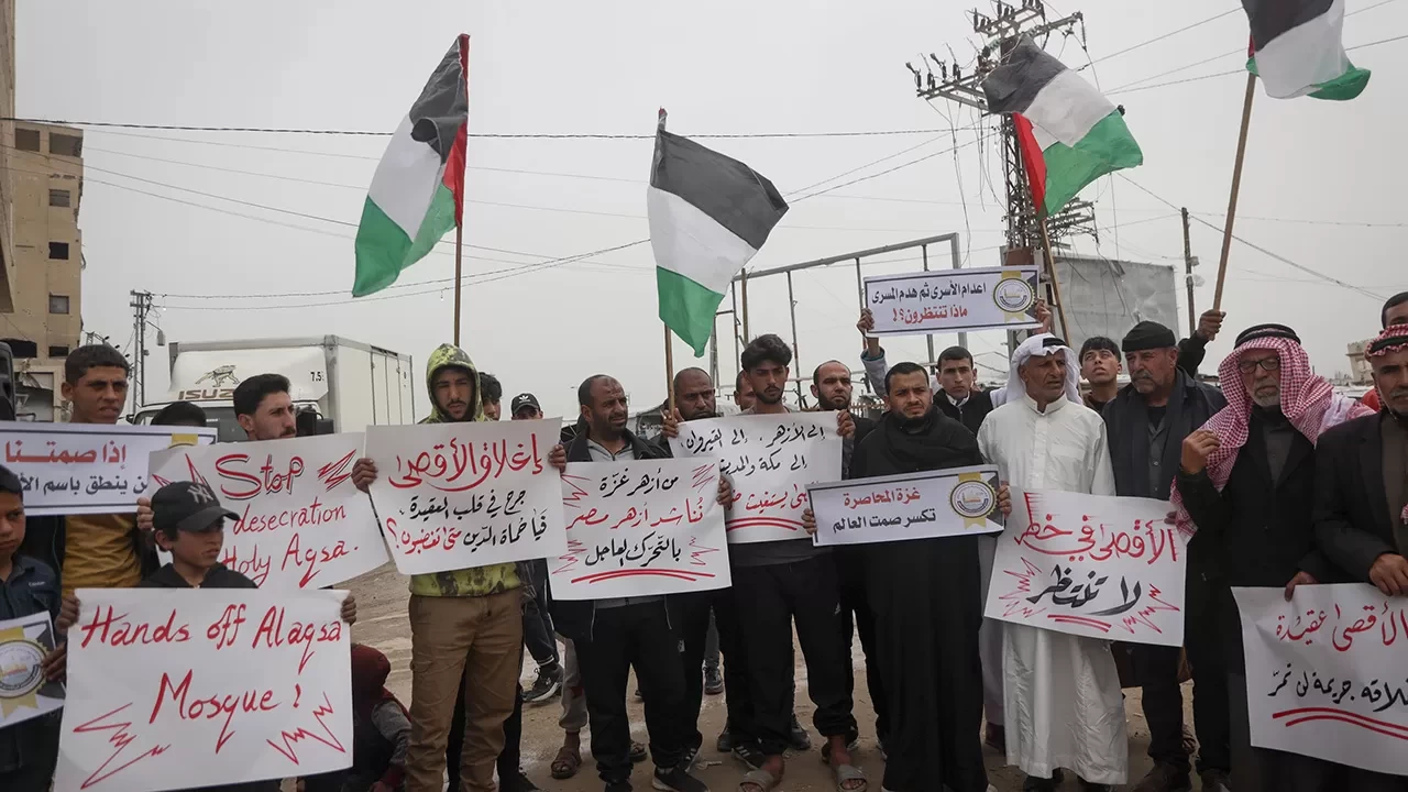 Gazze kentinin batısında, Filistin Vakıflar ve Din İşleri Bakanlığının çağrısıyla gerçekleştirilen protestoda, katılımcılar ihlallerin durdurulması ve Mescid-i Aksa’nın yeniden ibadete açılması için Arap ve İslam dünyasına çağrıda bulundu.