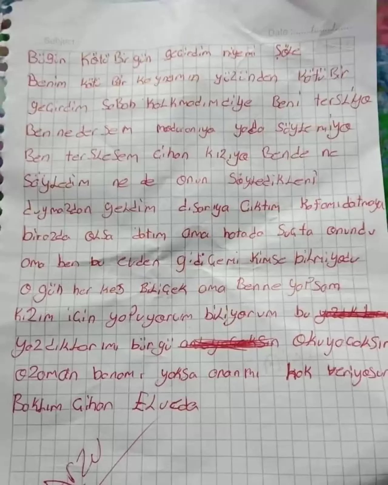 Ordu'nun Çaybaşı ilçesinde Anneler Günü'nde hayatına son veren 20 yaşındaki 1 çocuk annesi kadının, vefatından önce yazdığı notlar ortaya çıktı. Genç kadının, eşi ve kayınvalidesinden gördüğü kötü muamele nedeniyle yaşadığı sıkıntıları kağıda döktüğü öğrenildi.