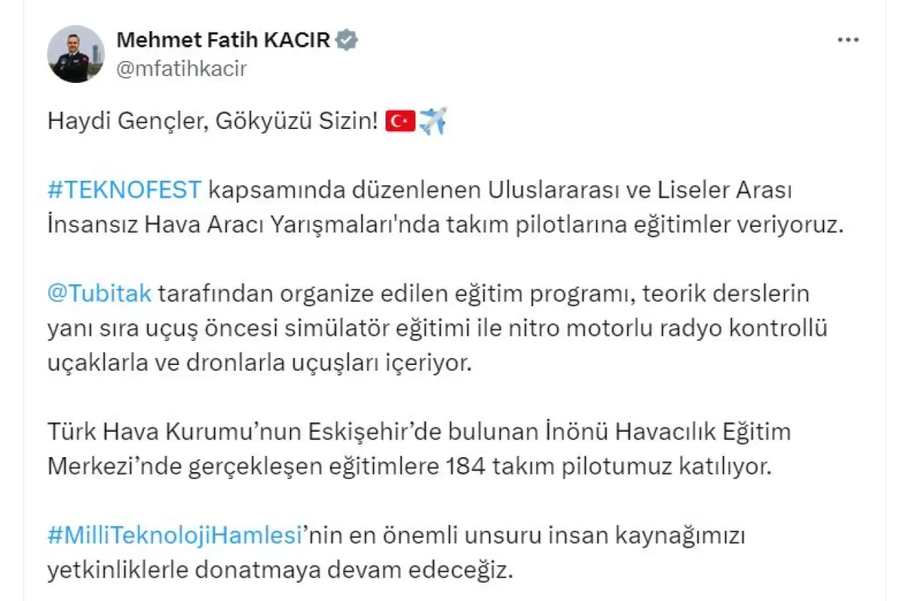 Bakan Kacır, sosyal medya hesabından yaptığı açıklamada, "TEKNOFEST kapsamında düzenlenen uluslararası ve liseler arası İnsansız Hava Aracı yarışmalarında takım pilotlarına eğitimler veriyoruz. TÜBİTAK tarafından organize edilen eğitim programı, teorik derslerin yanı sıra uçuş öncesi simülatör eğitimi ile nitro motorlu radyo kontrollü uçaklarla ve dronlarla uçuşları içeriyor. Türk Hava Kurumu’nun Eskişehir'de bulunan İnönü Havacılık Eğitim Merkezi'nde gerçekleşen eğitimlere 184 takım pilotumuz katılıyor. Milli Teknoloji Hamlesi'nin en önemli unsuru insan kaynağımızı yetkinliklerle donatmaya devam edeceğiz" dedi.