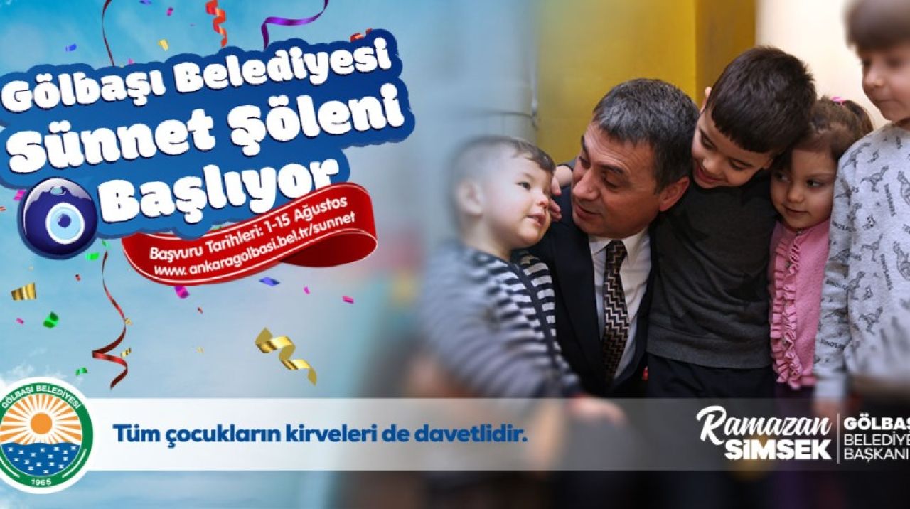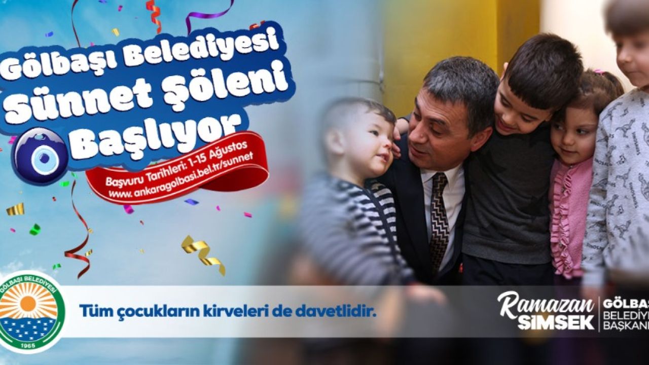 Gölbaşı Belediyesi Toplu Sünnet Şöleni başlıyor. Başvuruların 1-15 Ağustos tarihleri arasında www.ankaragolbasi.bel.tr/sunnet üzerinden yapılacağının duyurusunu yapan Gölbaşı Belediye Başkanı Ramazan Şimşek “Bu yıl 200 çocuğumuzu ücretsiz sünnet ederek, bu mutlu günlerine ve anlarına şahit olacağız. Çocuklarımızın sünneti; Gölbaşı Belediyesi Sağlık Ocağı’nda gerçekleştirilecek. Geleneklerimizin yarına taşınması ve yaşatılması için bütün çocuklarımızın kirveleri ile şölene katılımını bekliyoruz” dedi.