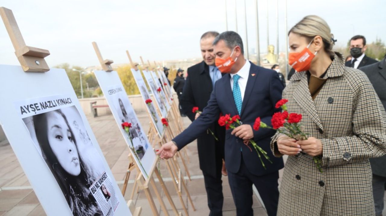 Sergi açılışı, şiddet görerek hayatını kaybeden kadınların resimlerine karanfil bırakılmasıyla son buldu.
