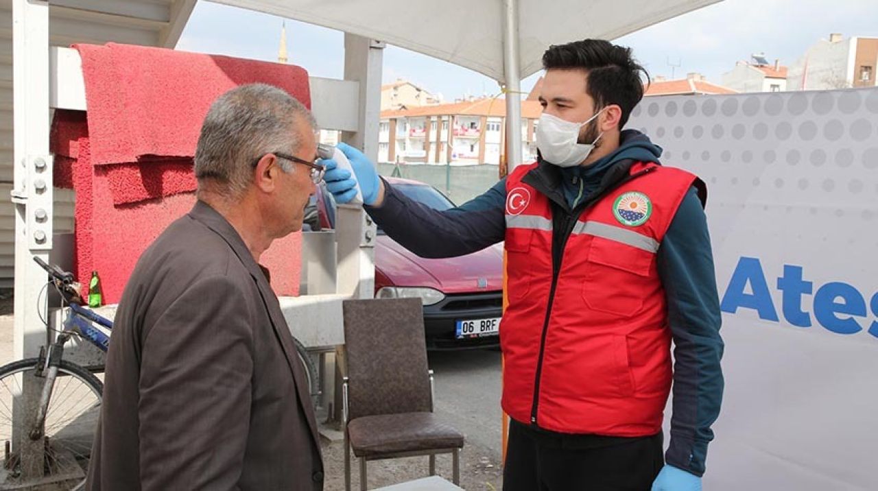 Gaziosmanpaşa Mahallesi, Bahçelievler Mahallesi ve Eymir Mahallesi TOKİ blokları gibi halkın yoğun olarak bulunduğu bölgede, isteyen vatandaşların dijital temassız ateş ölçerle vücut sıcaklıkları Gölbaşı Belediyesi sağlık ekipleri tarafından kontrol ediliyor.