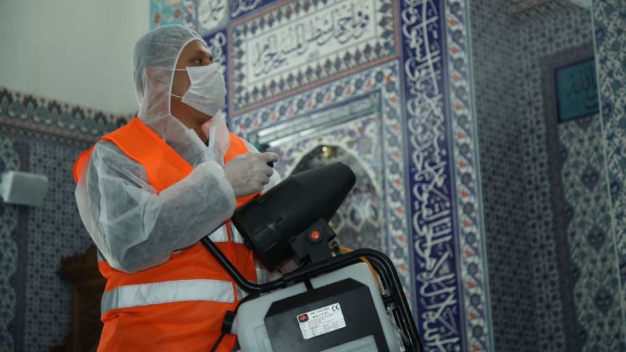 Gölbaşı’nda kılınacak cuma namazı öncesinde Belediye ekiplerince korona virüse karşı dezenfekte edildi.
