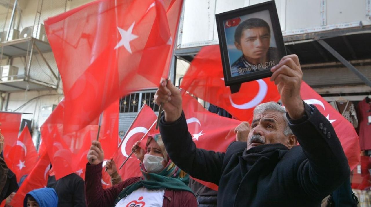 Cumhuriyet Caddesi'nde bir araya gelen aileler, ellerinde "Hakkari anneleri Diyarbakır anneleri el ele" yazılı pankart, Türk bayrakları ve çocuklarının fotoğraflarıyla HDP İl Başkanlığı binasının önüne kadar yürüdü.