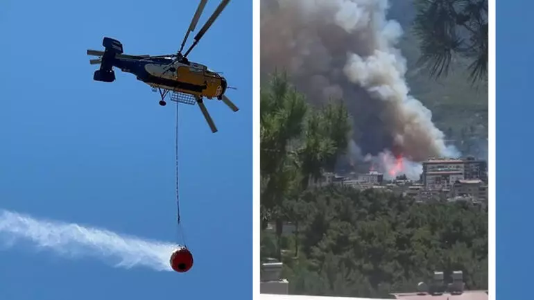 Öte yandan yangın dron ile havadan görüntülendi. Görüntülerde yangının geniş bir alanda devam ettiği ve helikopterlerin havadan yangına müdahale ettiği görülüyor.