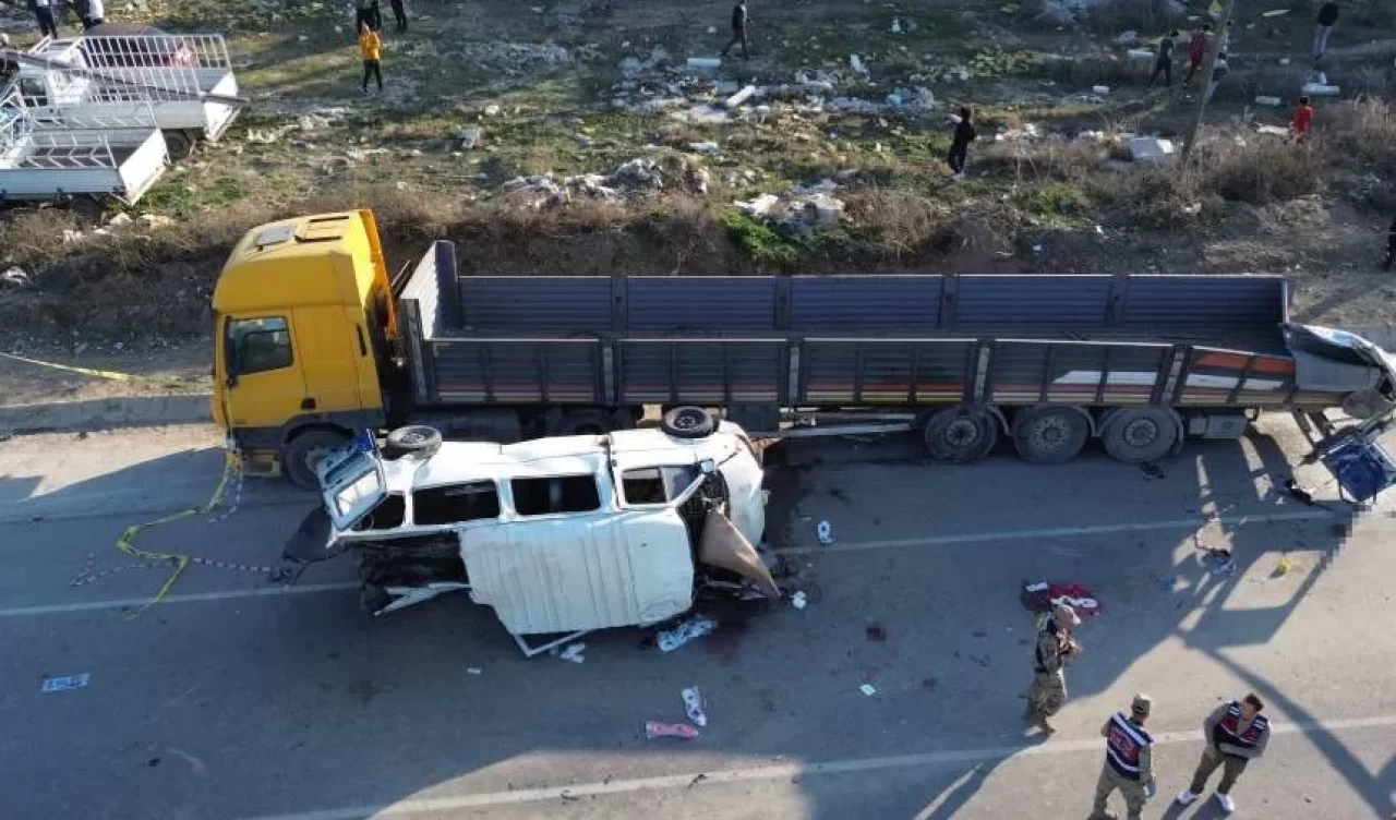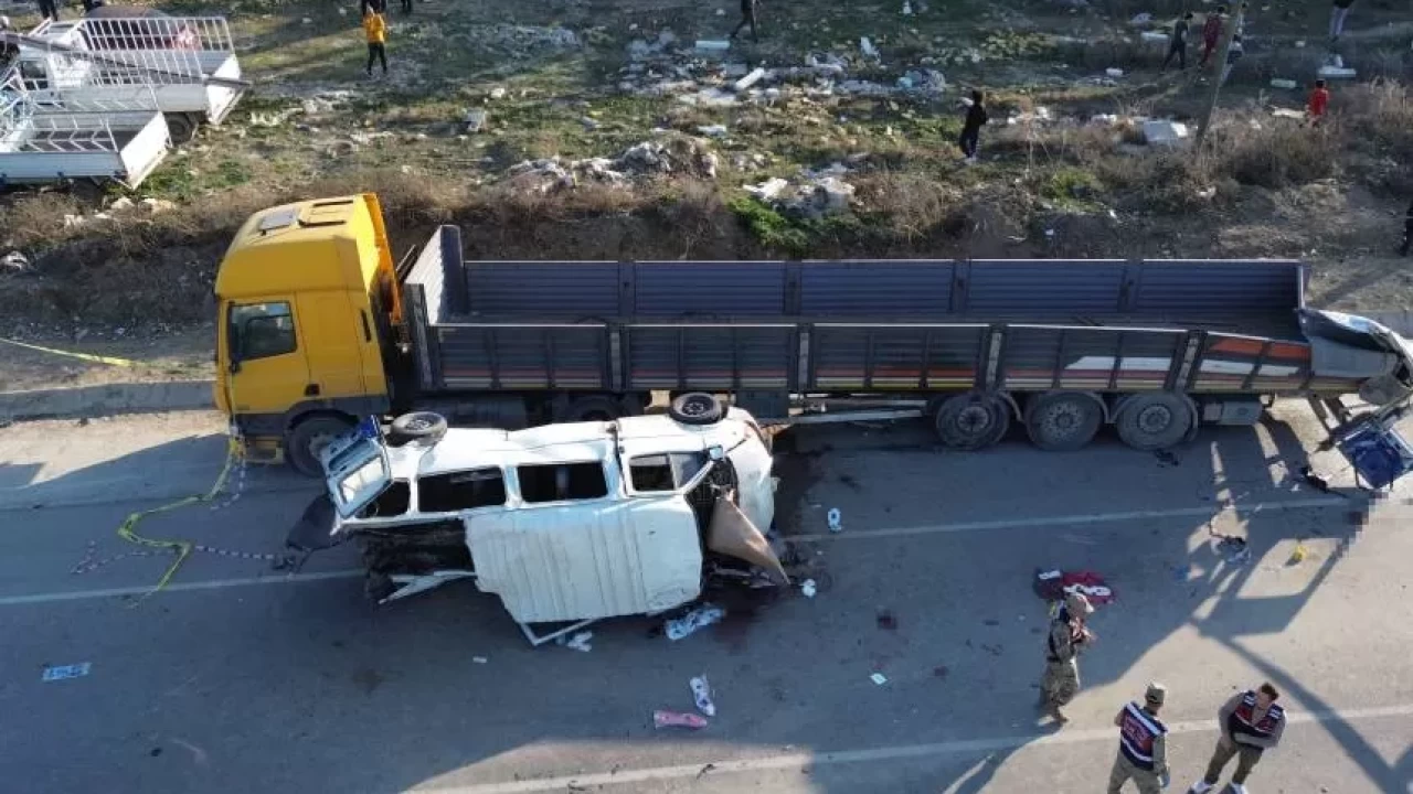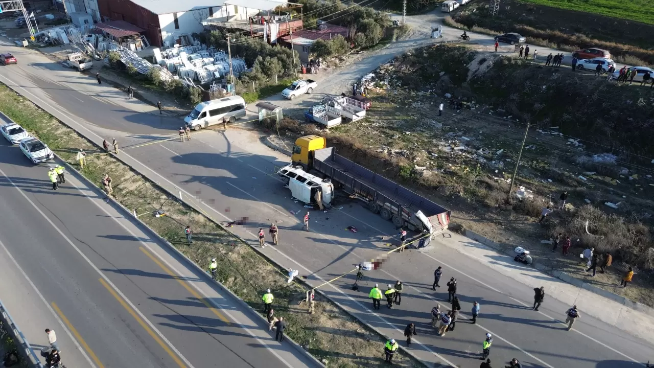 Hatay'da servis minibüsünün park halindeki tıra çarpması sonucu 6 kişinin öldüğü, 8 kişinin yaralandığı kaza yeri havadan görüntülendi.