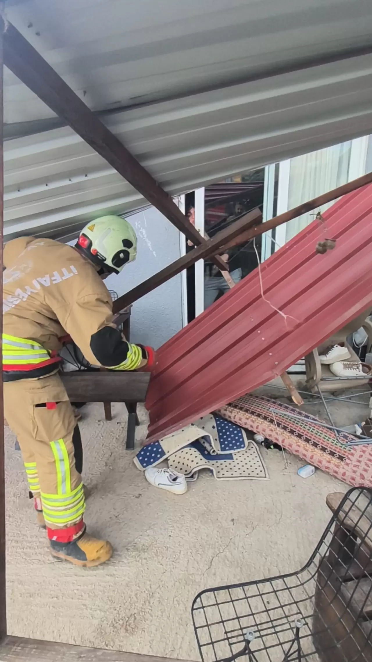 Çatının düştüğü evde mahsur kalan 3 kişilik aile, ekipler tarafından kurtarıldı.