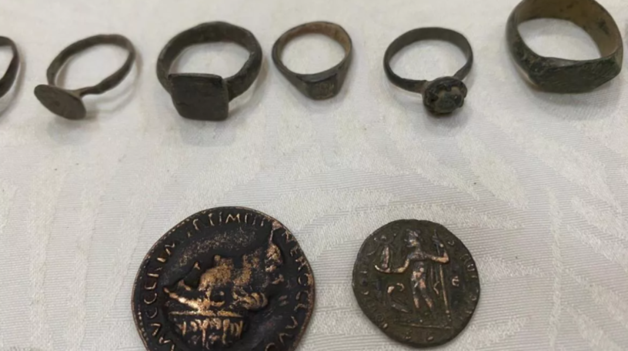 Şüphelinin çantasından, tarihi nitelik taşıdığı değerlendirilen 2 bin 620 sikke, 33 yüzük, 74 obje ve 4 toprak kandil çıktı.