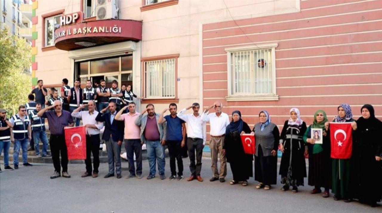 Çocuklarının dağa kaçırılmasından HDP'yi sorumlu tutarak partinin il binası önünde oturma eylemi yapan aileler, Türk bayrağı açtı, Barış Pınarı Harekatı'nı yürüten Mehmetçik'e asker selamı ile destek verdi.