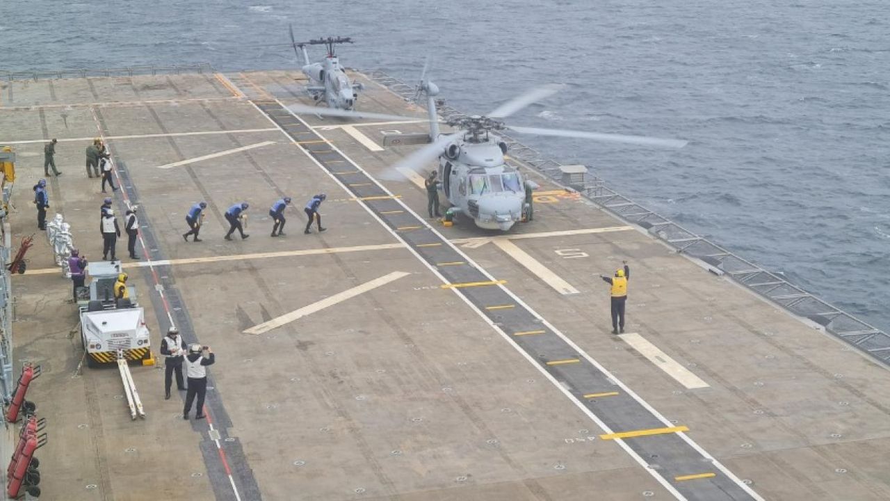 Deniz Kuvvetlerine ait AH-1W Super Cobra ve SH-70 Sea Hawk helikopterleri, LHD Anadolu'ya ilk inişi gerçekleştirerek konuşlanmayı tamamladı.