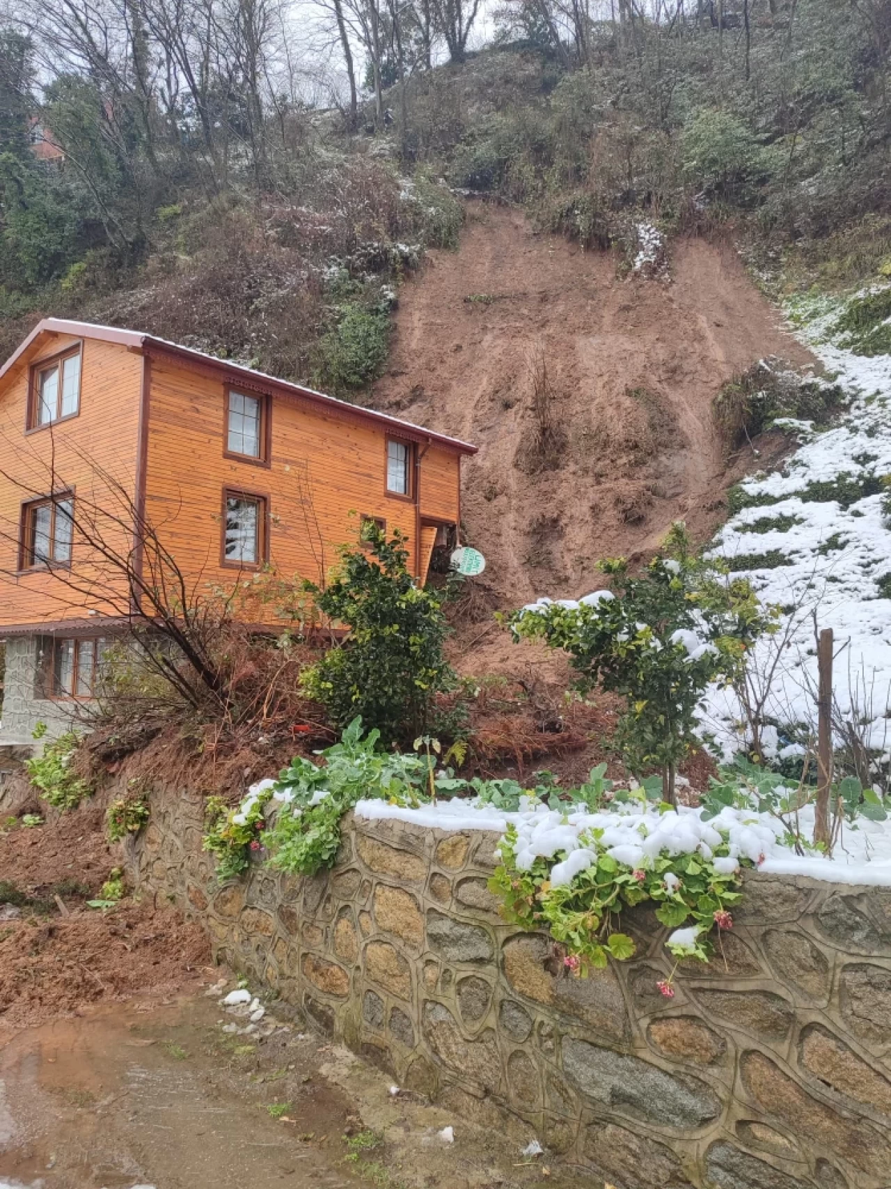 İlçede Çarşı Mahallesi'nde meydana gelen heyelan nedeniyle yamaçtan kayan toprak bir evin girişini kapattı.