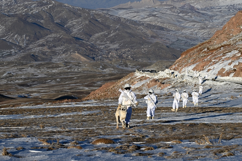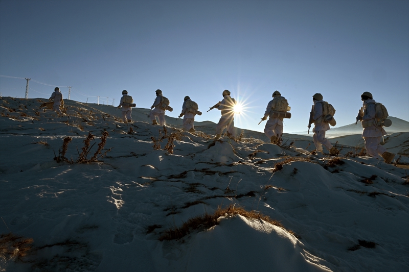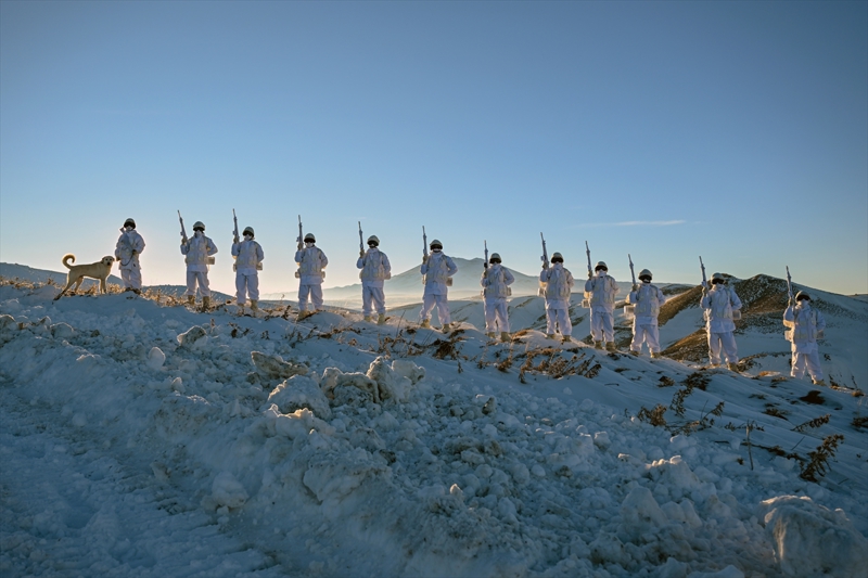 Her intikal öncesi komando andını okuyarak, 'Korku nedir bilmeyiz, biz dağların erleri' diyen Mehmetçik, coğrafi koşullara ve iklime uygun özel teçhizatlarını ve kar kamuflajlarını giyerek devriye görevini gerçekleştiriyor.