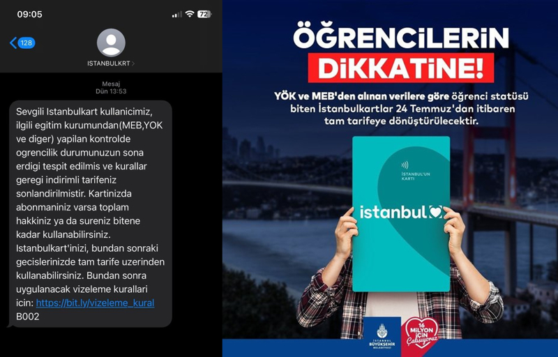 İstanbul Büyükşehir Belediyesi (İBB) İstanbulkart ile ilgili sosyal medya hesabından dün bir açıklama yaptı. İstanbulkart hesabından yapılan duyuruda öğrencilere seslenilerek "Öğrencilerin dikkatine; YÖK ve MEB'den alınan verilere göre öğrenci statüsü biten İstanbulkartlar bugünden itibaren tam tarifeye dönüştürülecektir" ifadeleri yer aldı.