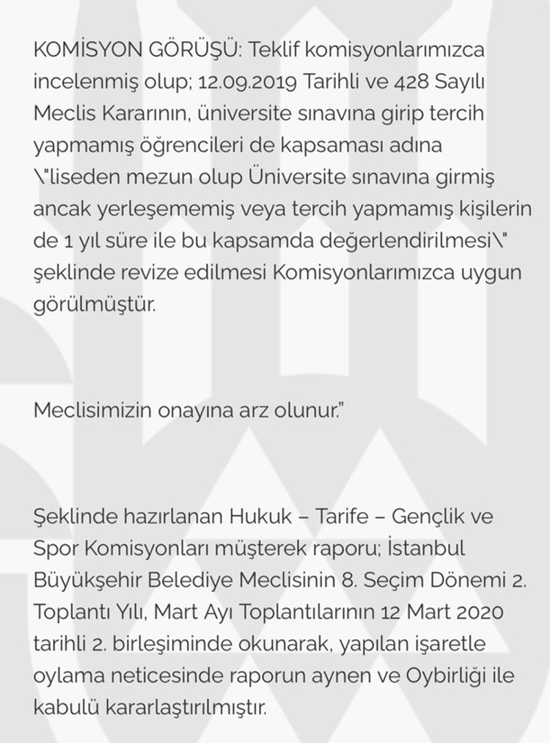 AK Parti İBB Grup Sözcüsü Avukat Murat Türkyılmaz, "Mecliste almış olduğumuz kararla; 'liseden mezun olup Üniversite sınavına girmiş ancak yerleşememiş veya tercih yapmamış kişilerin de 1 yıl süre işe bu kapsamda değerlendirilmesi...' şeklinde bir düzenlemeye gitmiştik. Yeni uygulamaya göre bu düzenleme hukuka aykırı bir şekilde uygulanmıyor" ifadelerini kullandı.