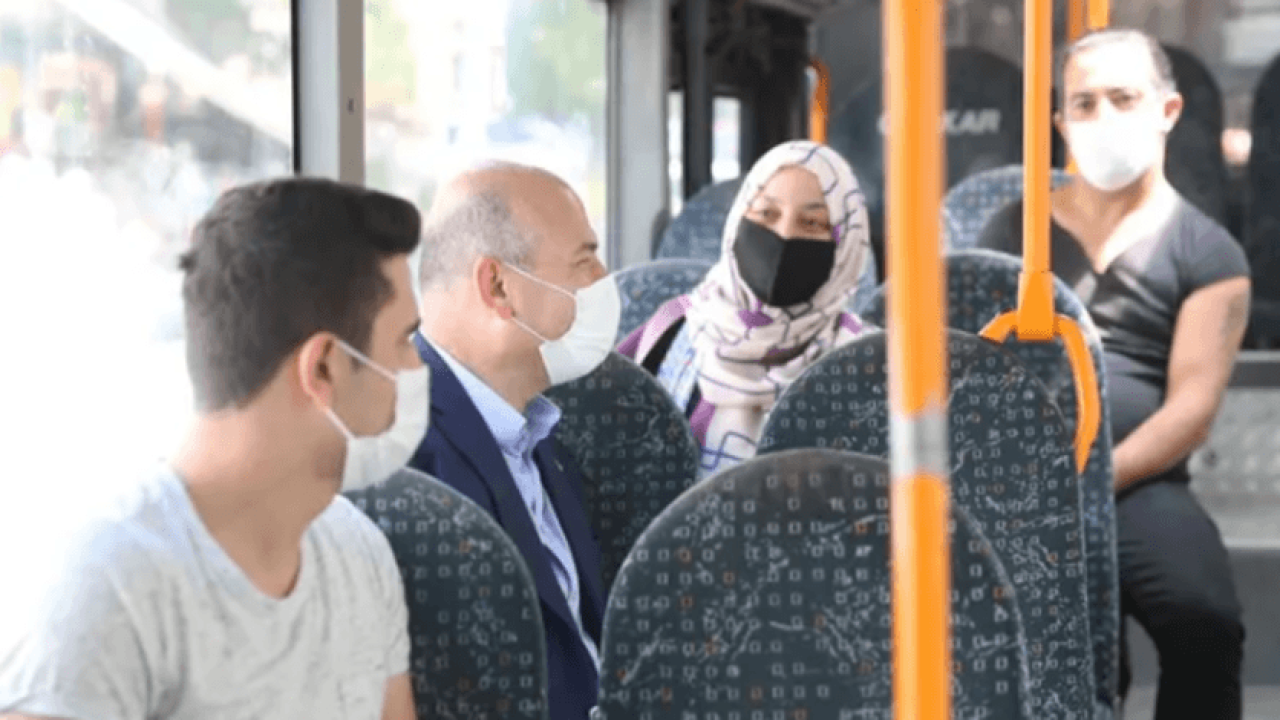Otobüsteki Kovid-19 tedbirlerini inceleyen ve yolcularla sohbet eden Soylu, "Eğer kurallara uymazsak sonuç iyi olmaz." dedi.