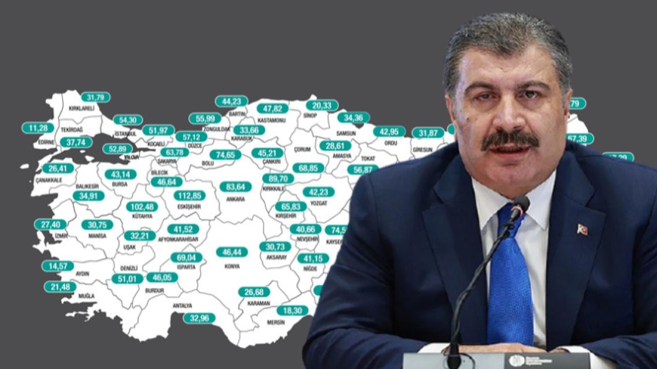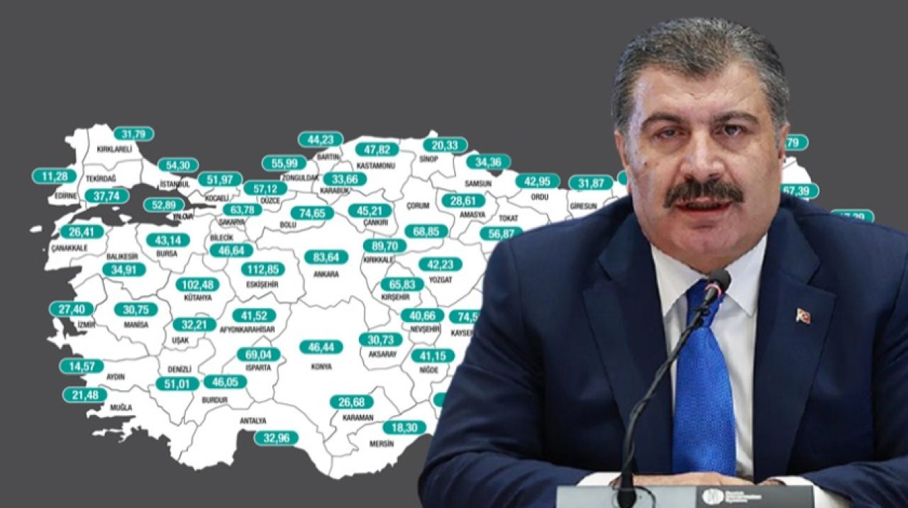 İllere göre haftalık Kovid-19 vaka sayısı, her 100 bin kişide İstanbul'da 54,30, Ankara'da 83,64, İzmir'de 27,40 oldu.