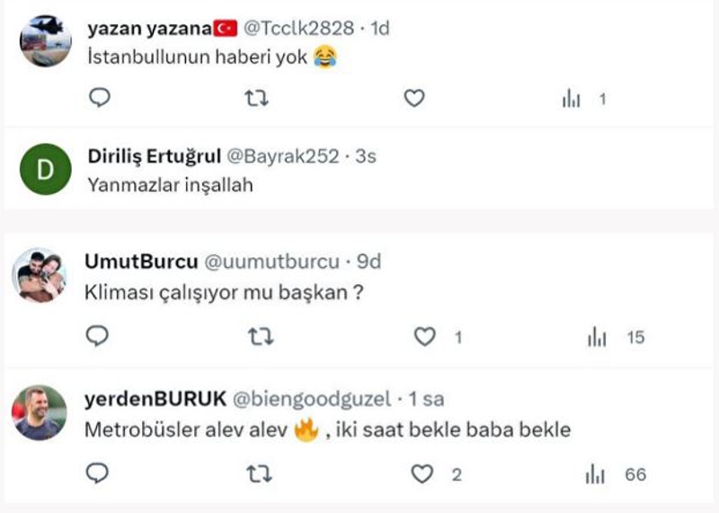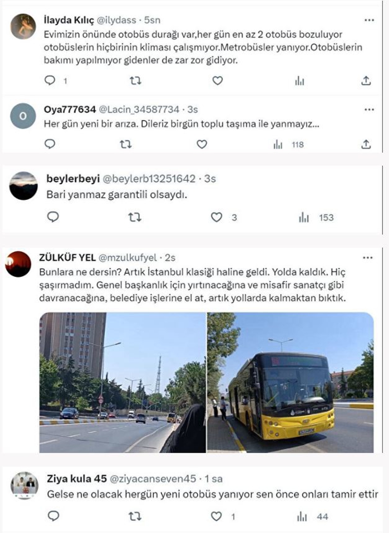 İmamoğlu'nun bu paylaşımına İstanbullulardan tepki geldi. Metrobüs ve otobüslerde yaşadıkları zorlukları dile getiren vatandaşlar, yanıp yolda kalan, geç gelen ve kliması çalışmayan araçlar sebebiyle isyan etti.