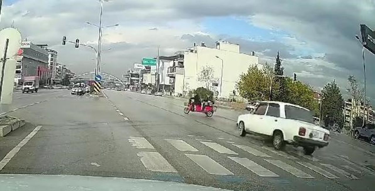 Denizli’nin Pamukkale ilçesinde kavşakta ışık ihlali yapan otomobil ve elektrikli motosiklet çapıştı. İki kişinin yaralandığı kaza, kırmızı ışıkta beklemekte olan diğer bir aracın kamerasına yansıdı.