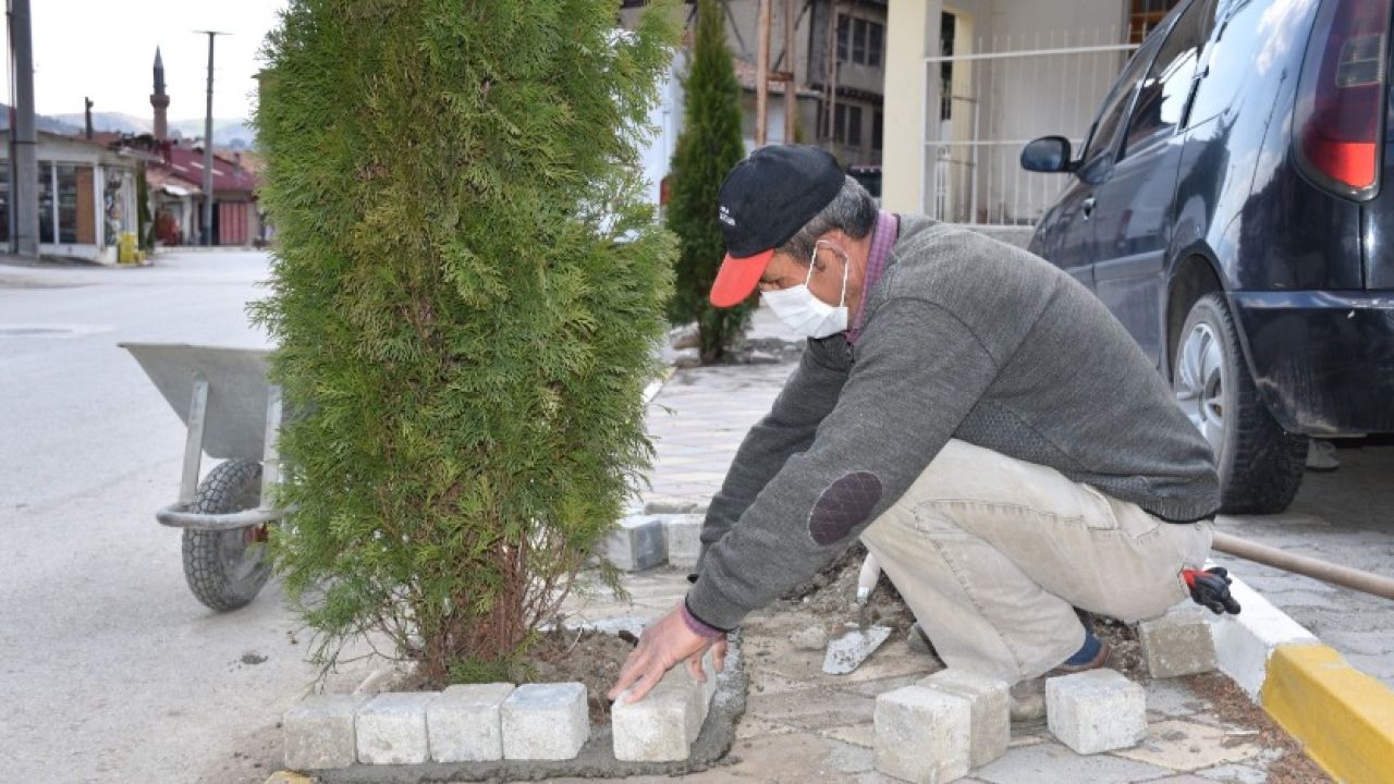Belediye Park ve Bahçeler Müdürlüğü tarafından dikimi gerçekleştirilen, Fidanların sulanması esnasında taşmaması için; Belediye Ekipleri Fidanların kenarlarını çanak şeklinde taşlarla örüyor.