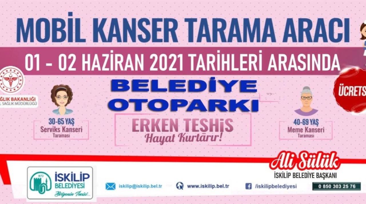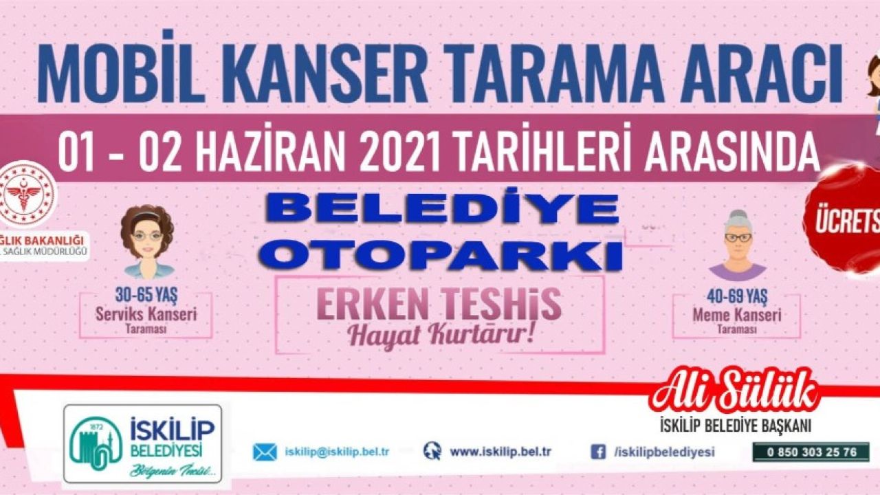 Başkan Ali Sülük yaptığı açıklamada, “ 01- 02 Haziran 2021 tarihleri arasında İl Sağlık Müdürlüğü ve Kadın Adaylarını Destekleme Derneği işbirliği içerisinde İlçemizde ki kadınlarımıza Kanser taramasını ücretsiz yapacağız. Belediye Otoparkımızda konumlandıracağımız Mobil Kanser Teşhis Aracıyla, belirtilen yaş aralıklarındaki tüm kadınlarımıza ücretsiz Kanser taraması yapacağız. Unutmayın ‘Erken teşhis hayat kurtarır’ ”dedi.