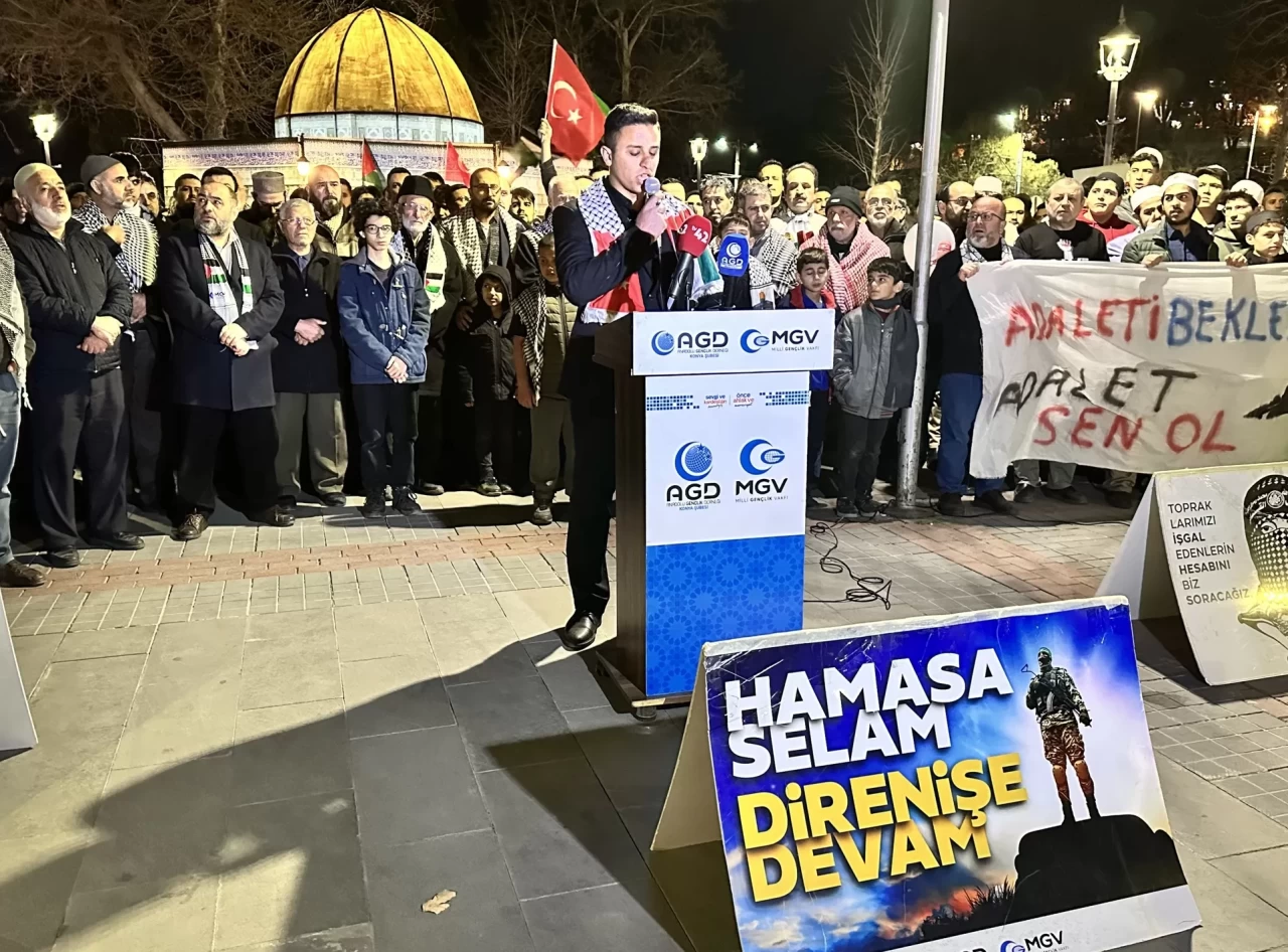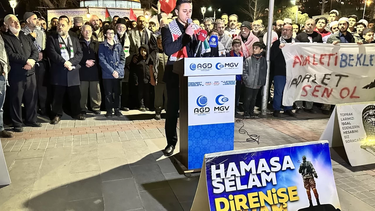Kültürpark'ta bir araya gelen grup, Filistin bayrakları taşıdı ve tekbir getirdi.