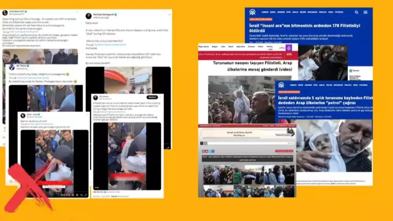 Cumhurbaşkanlığı İletişim Başkanlığı Dezenformasyonla Mücadele Merkezi(DMM), İsrail propagandası yapan sosyal medya hesaplarından paylaşılan görüntülerle ilgili, 'Hamas propagandası: Gazze'de bir kadın çocuğuymuş gibi oyuncak bir bebeğe sarılarak ağladı' iddiasının doğru olmadığını açıkladı. İsrail'in yalanını Anadolu Ajansı'nın haberi ifşa etti.