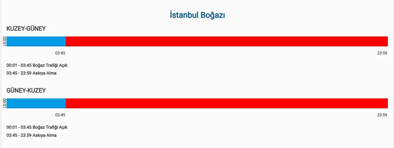 İstanbul Boğazı'nda gemi trafiğinin 03.45 itibarıyla çift yönlü olarak kapatıldığını duyurdu.