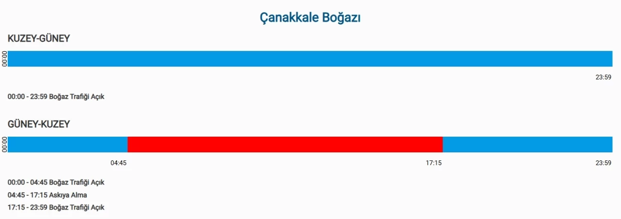 Çanakkale Boğazı'nda ise gemi trafiği 04.45-17.15 saatleri arasında Güney-Kuzey yönünde askıya alındı.